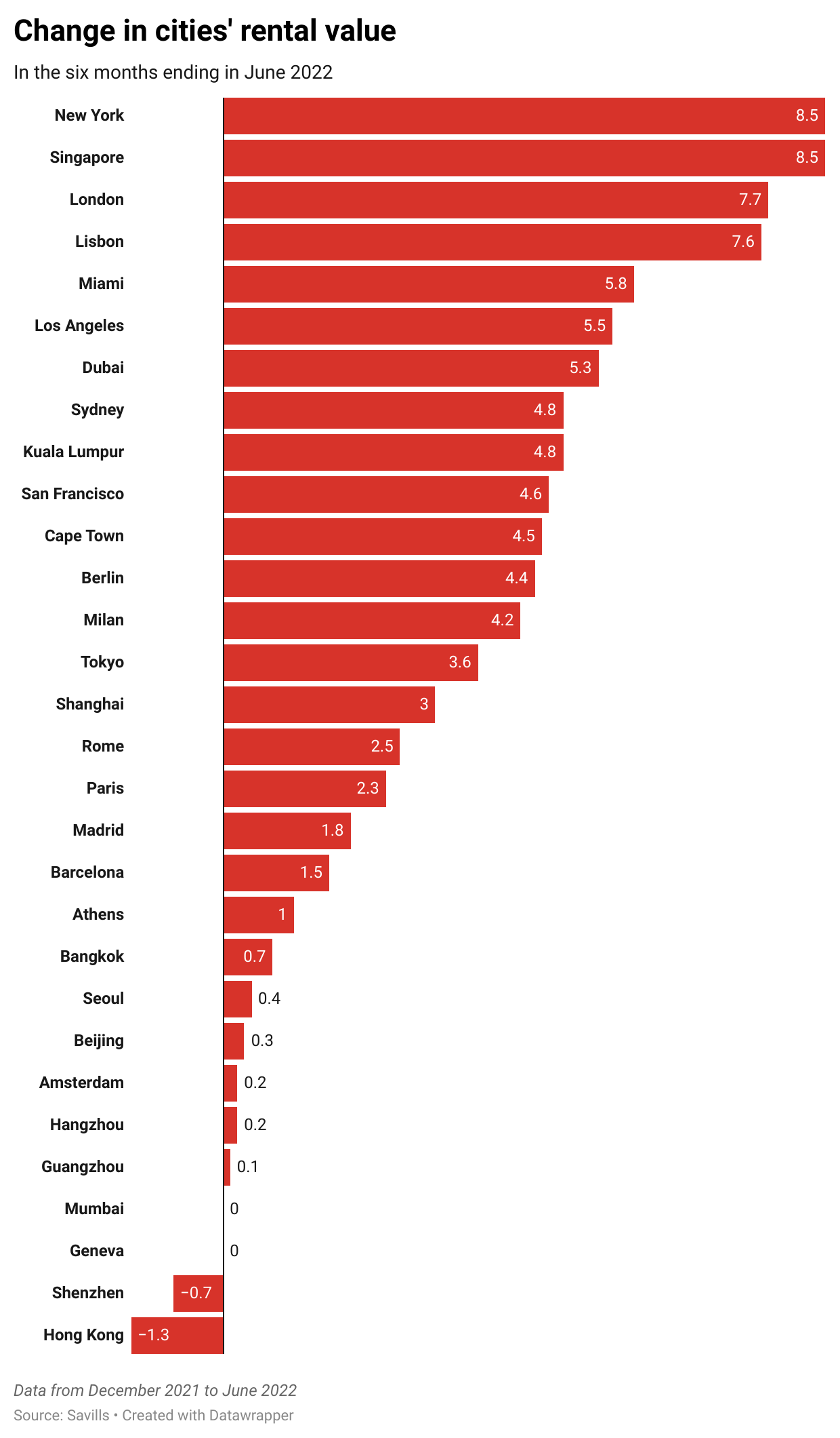 Not every city in the world is seeing rental prices surge, and some in fact are even seeing declines. The return of international travel has been a boon to cities’ rental markets, Savills said, and in places where strict travel restrictions are still in place, prices have either remained stable or fallen.