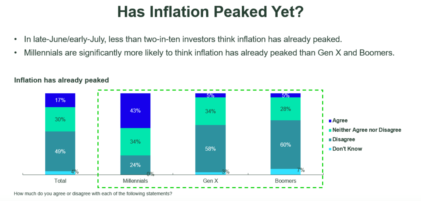 State Street Global Advisors, the asset management business of State Street Corporation (NYSE: STT), released its Inflation Impact Survey on Aug. 9. About 67% of investors are concerned about the economic outlook in the U.S. over the next 12 months. However, the survey also found that millennials (43%) are "significantly" more likely to agree that inflation has already peaked, compared to Gen X (5%) and baby boomers (5%). And 63% of millennials are confident they can reach their financial goals. The findings are based on an online survey of adults and an analysis of 243 adults with Investable Assets (IA) of $250K or more.