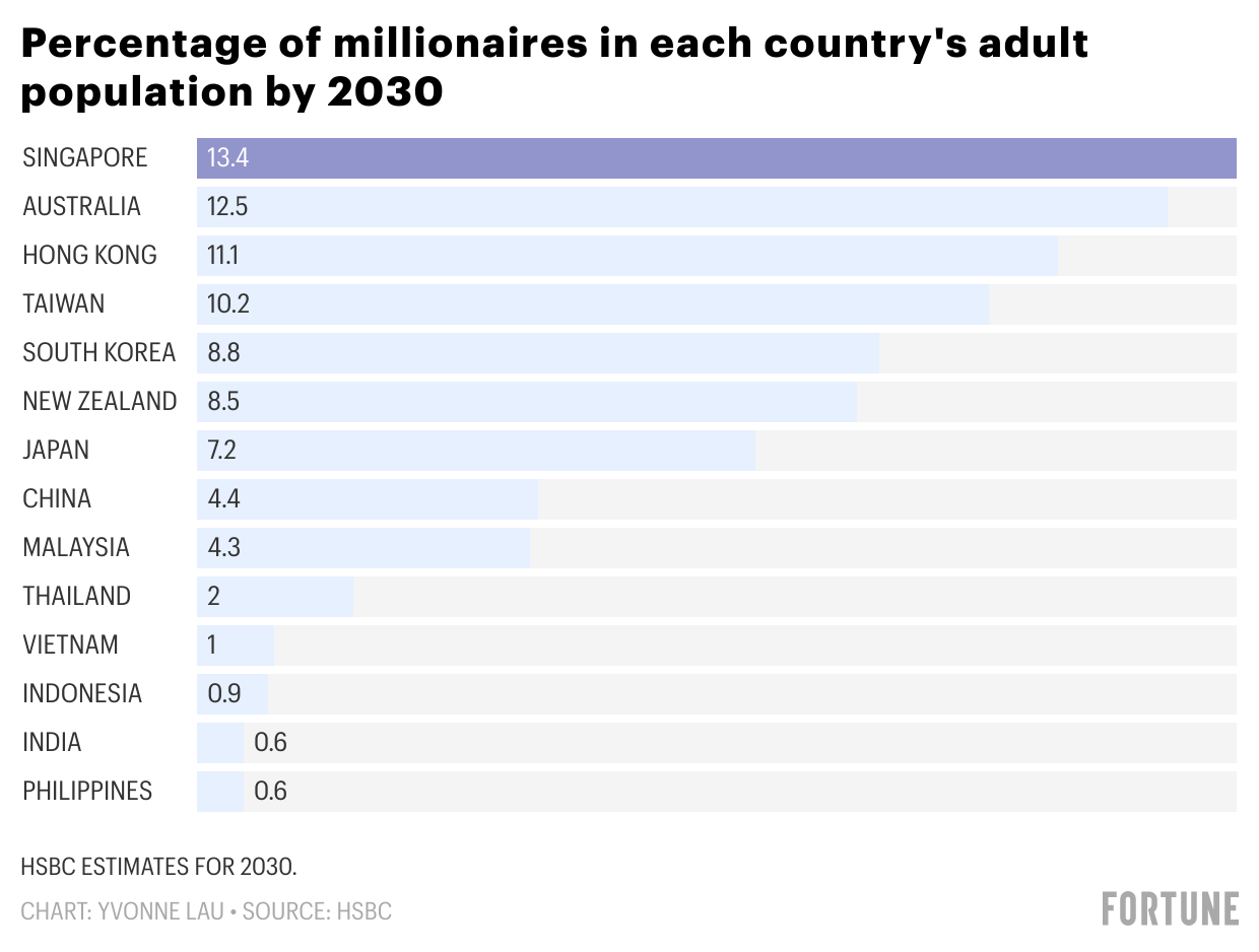In eight years, over 13% of Singapore’s adult population will be worth $1 million or more, surpassing the proportion of millionaires in the U.S., China, and 12 other Asia-Pacific economies, according to a new report by global bank HSBC.
