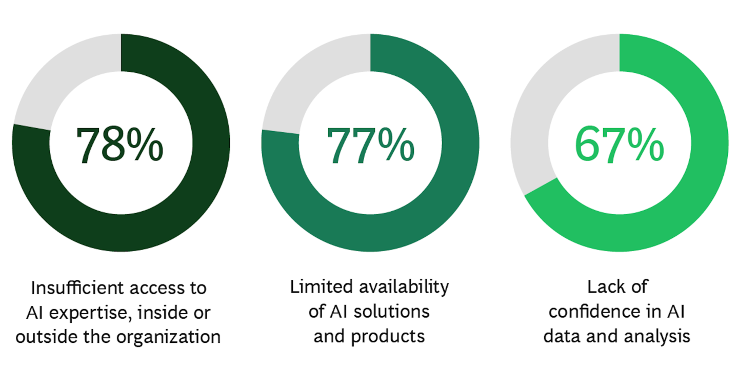 With so many powerful opportunities for A.I. to make a difference in this struggle, what’s holding organizations back from putting it to greater use? While there are already areas in which A.I. solutions are well established and ready for broad application, most existing solutions are scattered, can be inaccessible, and lack the resources to scale. Among survey respondents, 78% say the roadblocks are due to insufficient AI expertise, 77% cite limited availability, and 67% point to a lack of confidence in A.I.-related data and analysis.