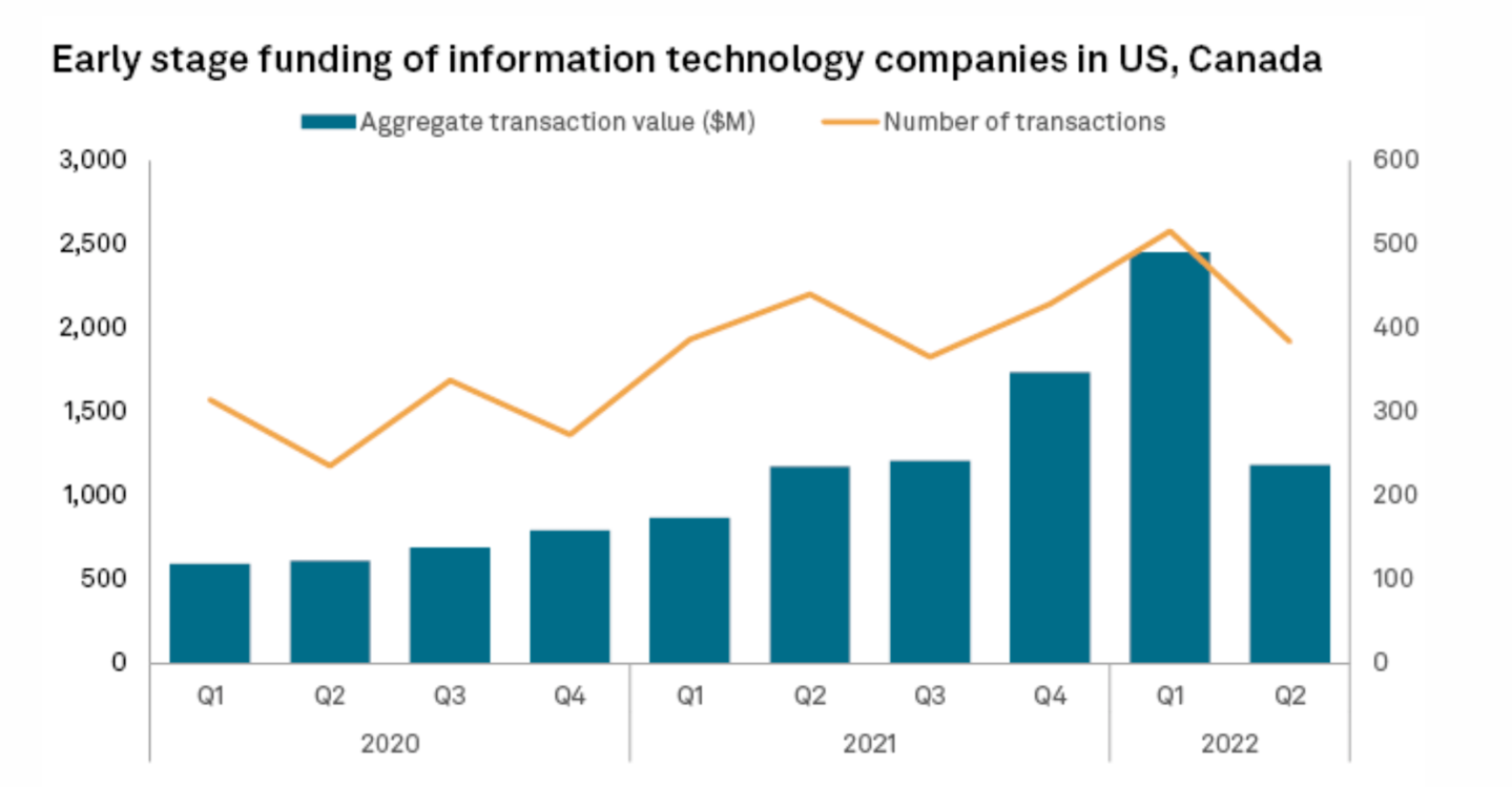 After posting record-high figures in Q1 of 2022, early-stage funding in information technology companies in the U.S. and Canada slowed down in the second quarter, an S&P Global Market Intelligence report found. In the sector, the number of early funding transactions by private equity firms decreased to 384 in Q2, compared with 516 in the previous quarter. The sector raised $2.45 billion in Q1. "However, the number plummeted by 52% to $1.19 billion in the second quarter," according to the report. The research on early-stage funding includes pre-seed funding, seed funding, accelerator funding, crowdfunding, and angel investments.