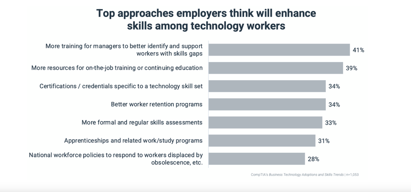 Seventy-two percent of executives identify technology as a primary factor in reaching organizational objectives, according to a new report from CompTIA, the nonprofit association for the IT industry and workforce. More than half of businesses (57%) report using outsourced tech firms frequently or regularly, and another 29% do so occasionally. The most sought-after services are cloud computing, cybersecurity, data analytics, and artificial intelligence, according to the report. One of the key findings is there is a wide array of workforce gaps employers believe contribute to tech workforce hiring and retention issues, including speed of innovation exceeding the pace of training. The top approach employers think will enhance skills among tech workers is more training for managers to identify skills gaps (41%). The findings are based on a survey of executives and professionals from more than 1,000 businesses in the U.S., U.K., Australia, Germany, Japan, the Netherlands, and Singapore.
