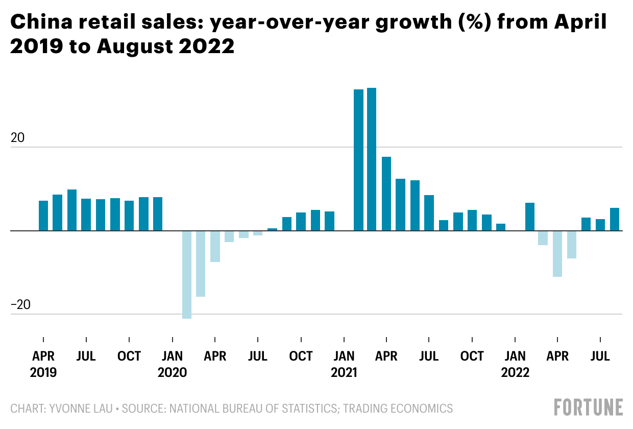 This year, the Chinese authorities’ harsh and protracted COVID lockdowns, alongside a deepening property crisis and high youth unemployment, tanked consumer sentiment. China’s year-over-year retail sales growth surged to 34% in March 2021 as people believed the country was nearing the end of COVID. But a year later, in March 2022, that exuberance tempered, and China’s retail sales fell 3.5% and then 11.1% in April. The latest August numbers show a pickup—a 5.4% gain—from a year ago, though experts warn that many factors are still weighing on consumer demand.