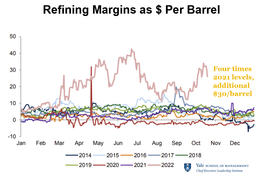 * Gasoline prices should have fallen recently to match the decline in crude oil, but refineries are enjoying a soaring windfall, with profits quadrupling from 2021 levels. Refiners have added $30 a barrel in refining margins on top of the price of crude—even though 1 million barrels per day in refining capacity was added in 2022 with more coming in 2023. That’s not counting the return of hundreds of thousands of barrels of capacity which was taken offline due to idiosyncratic outages and disruptions the last couple months due to refinery mismanagement.