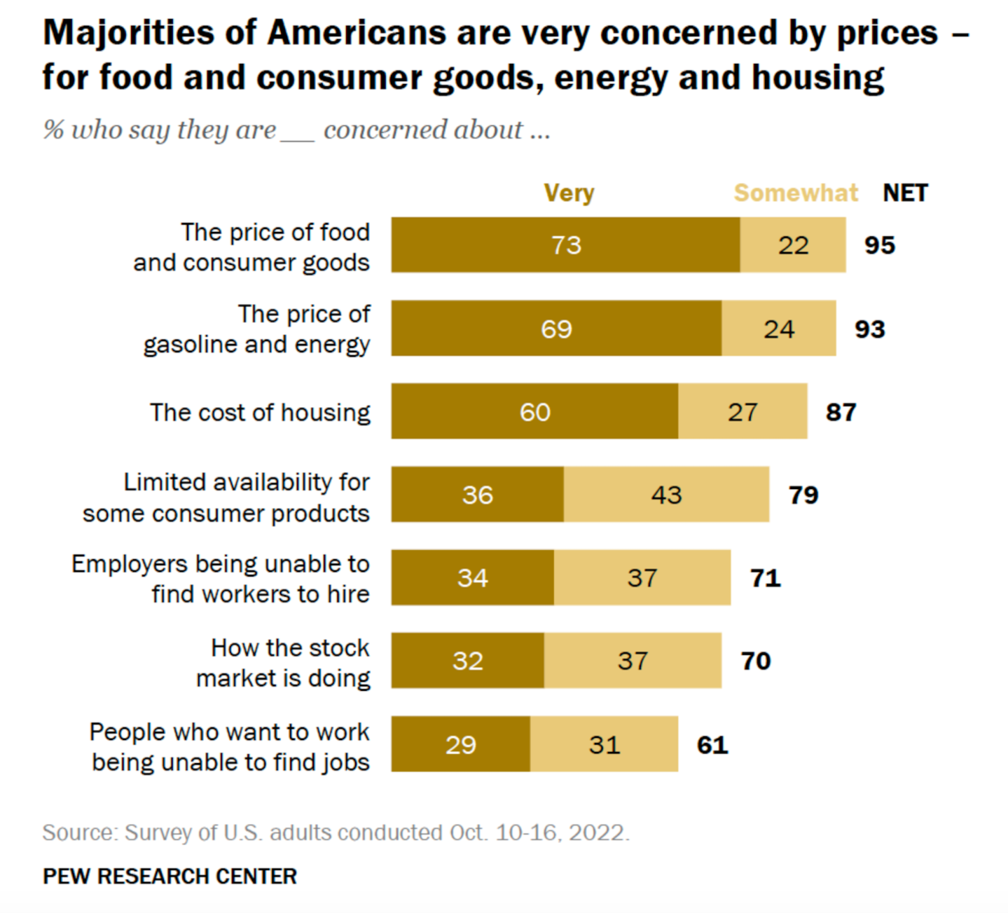 More Americans are worried about inflation than the shortage of employees, according to a new national survey by Pew Research Center. The three top concerns for Americans among seven items are the price of food and consumer goods (73% are very concerned), gasoline and energy (69%), and the cost of housing (60%). Fewer respondents are very concerned about product shortages (36%) and employers being unable to find workers (34%). The stock market’s performance or a shortage of jobs for people who want to work are also the least of concerns for most Americans, Pew found. Public economic concerns have shown little movement since the summer, according to the report. The findings are based on a survey of 5,098 adults, including 3,993 registered voters, conducted from Oct. 10 to 16.