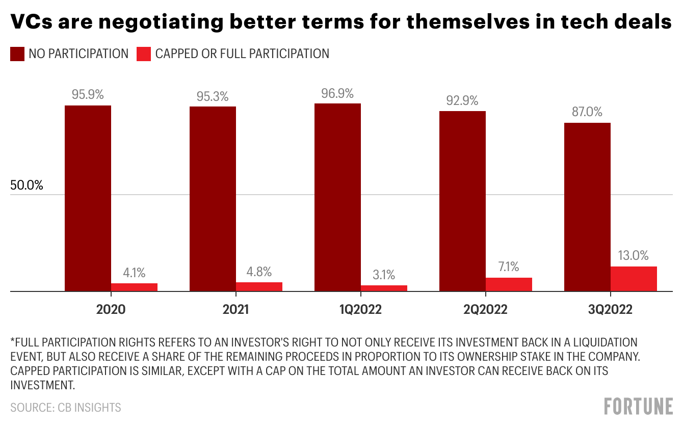 Venture capitalists continue to take fewer risks on the term sheet, negotiating stronger downside protection. Of the deals that closed this quarter, 13% of late-stage deals had capped or partial participation, meaning investors negotiated the right to not only get their investment back in the case of liquidation but also a cut of the remaining proceeds. That’s twice the number of deals in which investors negotiated those terms last calendar year.