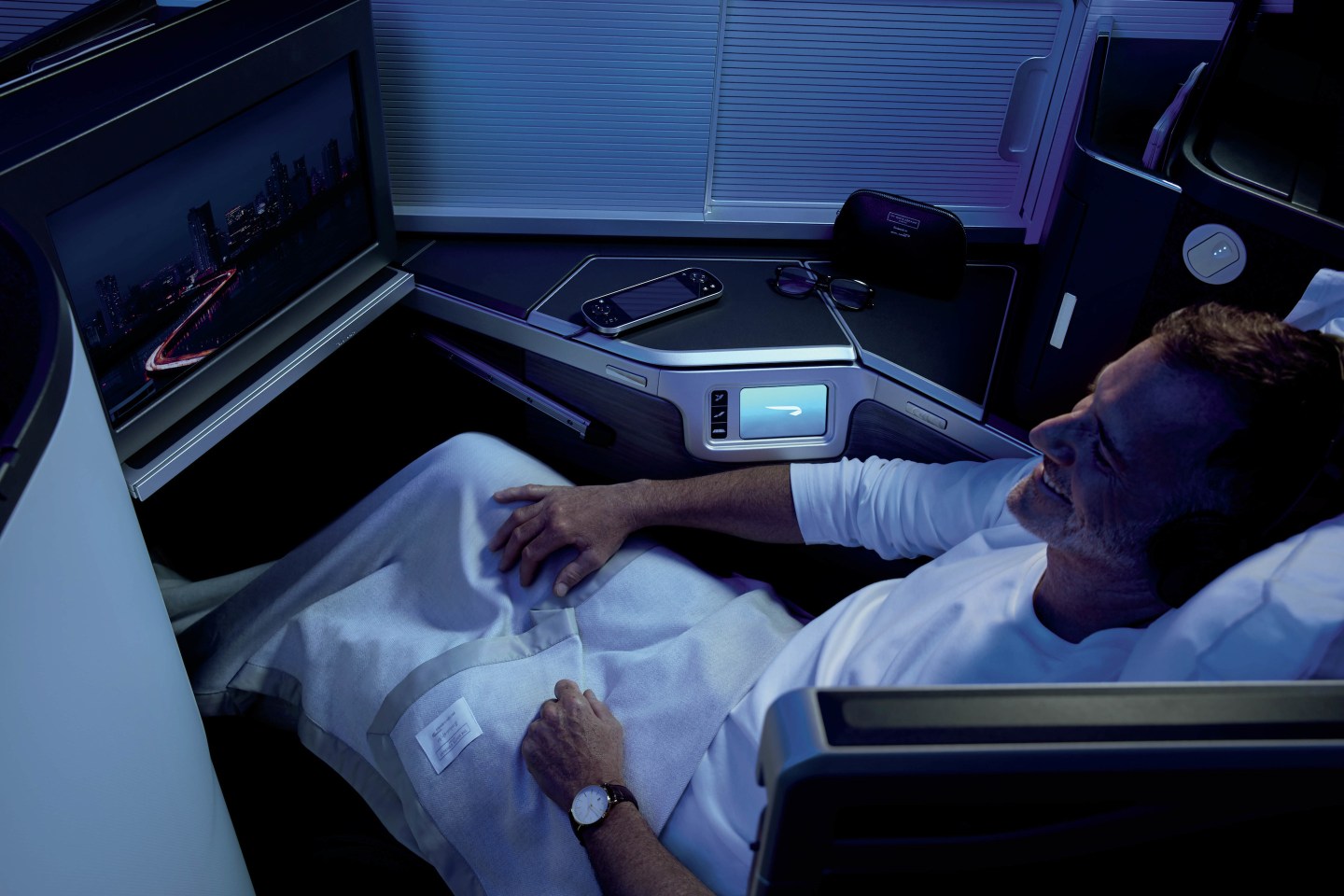 The upgraded cabin layout brings direct-aisle access and a suite door for greater privacy while maintaining high levels of comfort with White Company bedding and a more comfortable flat-bed seat in a one-two-one configuration across each row.