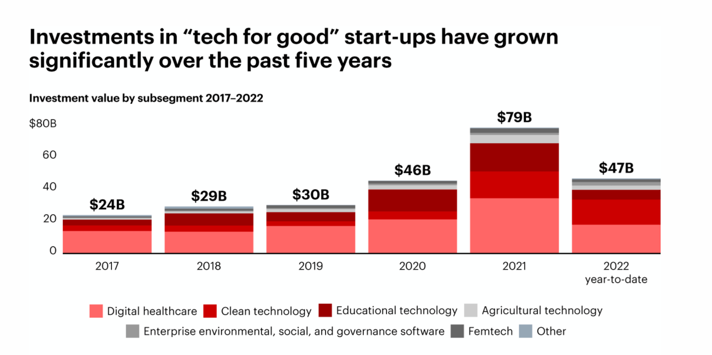 A new Bain & Company analysis of data from its Startup Investment Cruncher and Crunchbase found that investments in “tech for good” start-ups reached a record $79 billion last year. "Although venture capital and minority private equity investments in this category—which includes digital healthcare; educational technology; clean technology; enterprise environmental, social, and governance (ESG) software; and other sectors advancing innovations with potential societal benefits—has slowed in 2022 amid an overall pullback in start-up funding, the year-to-date value is still already 'tech for good’s' second-highest total on record and nearly double the 2017 total," according to the report.