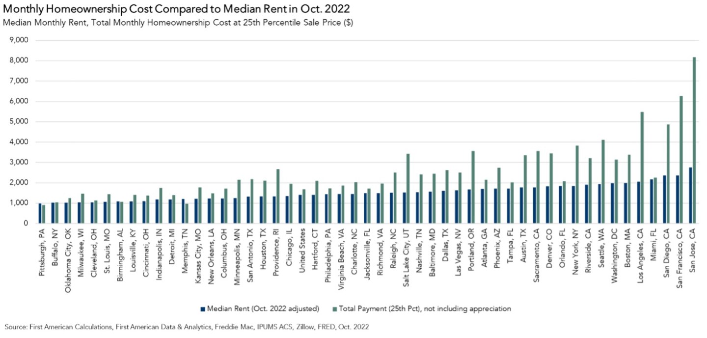 After accounting for the total monthly homeownership cost and comparing it with the median rent by market, it was better to rent than to own for potential first-time homebuyers in 47 of the 50 top U.S. markets. The three exceptions were Birmingham, Memphis, and Pittsburgh.