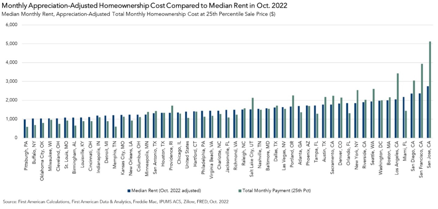 The rebalancing of the housing market makes it difficult to project what the pace of appreciation will be across the top 50 markets. However, the average historical annual rate of house price appreciation between 1988 and 2019 was 3.8%. When accounting for this conservative appreciation benefit in our rent-versus-own analysis, it was cheaper to rent in only 20 of the top markets. The graph below compares, by market, the cost of renting with the cost of owning adjusted for the average annual pace of house price appreciation.