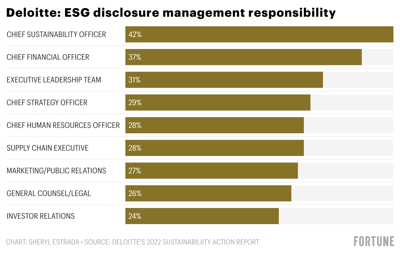 Deloitte's sustainability action report gauges progress on environmental, social, and governance (ESG) disclosure and preparedness. More than half (57%) of executives surveyed report having implemented a cross-functional ESG working group tasked with driving strategic attention to ESG. Sixty-one percent of respondents said they were prepared to disclose Scope 1 GHG emissions, and 76% are prepared to disclose Scope 2 GHG emissions, and increase from 47% in 2021. However, only a thrid said they're prepared to disclose Scope 3 details. The survey also found that chief sustainability officers (42%) and CFOs (37%) are primarily responsible for managing ESG disclosure. "The involvement of the CFO or chief sustainability officer is a strong signal that businesses are integrating ESG reporting into business strategy," according to the report. The data is based on a survey of 300 executives.