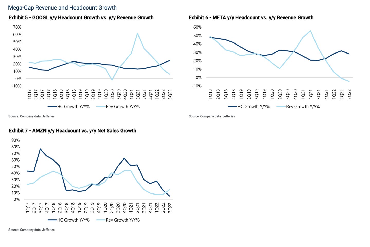 Google is the only mega-cap tech company that has not announced layoffs, Jefferies pointed out, although it noted that it implemented a hiring freeze earlier this year.