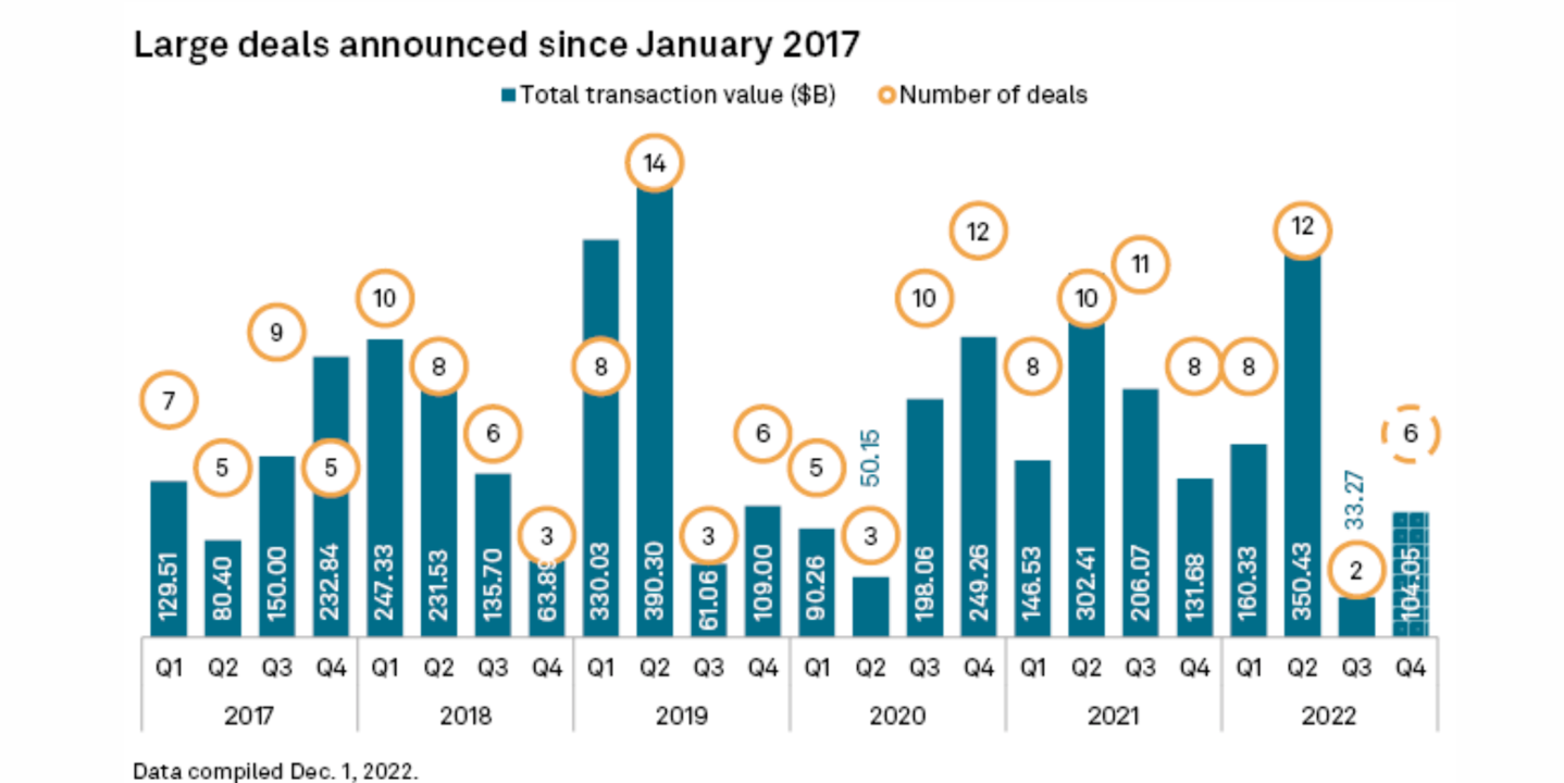 In November, there were five $10 billion-plus M&A deals worldwide, breaking a streak of five-straight months featuring two or fewer such deals, a new S&P Global Market Intelligence data analysis found. The largest deal of the month was Johnson & Johnson's $18.04 billion acquisition of Abiomed Inc., announced Nov. 1., according to the report.