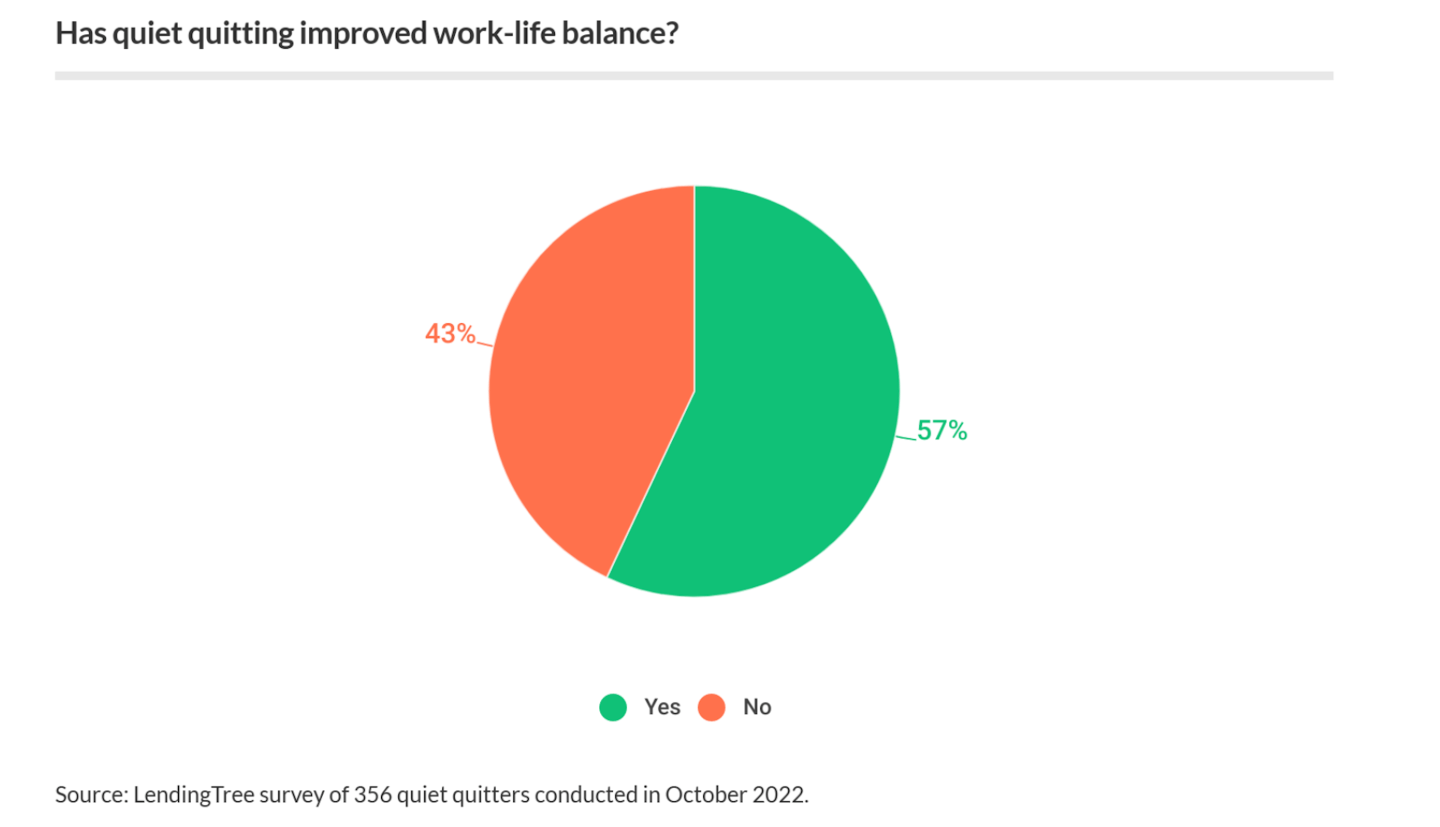 Quiet quitting is when employees simply perform their duties without going the extra mile to avoid burnout or a response to feeling devalued by their company. A new LendingTree report finds that quiet quitters surveyed believe they've benefitted from the movement, as 57% say their work-life balance has improved. Because they've set boundaries, 40% of quiet quitters say they’re more engaged at work than in the past. But there needs to be more communication between workers and managers for a productive solution, the report finds. “Setting and maintaining boundaries isn’t easy,” LendingTree chief credit analyst Matt Schulz said in a statement. “It requires honest discussions with your supervisors and co-workers." If not, these employees may end up just leaving. More than half (56%) of quiet quitters say they’re searching for new roles, according to the report.