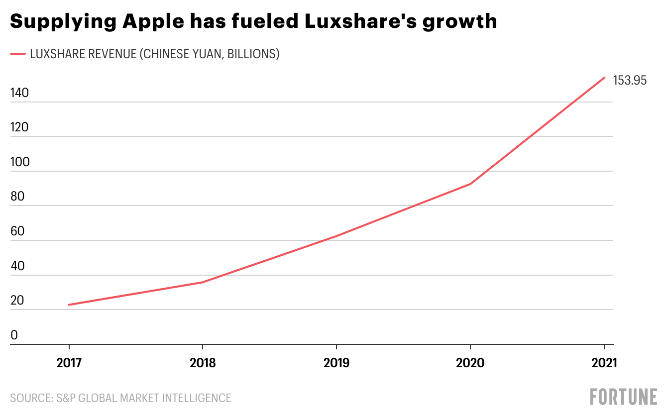 When Luxshare went public on the Shenzhen stock exchange in 2010, its annual operating revenue was 1 billion yuan ($141.3 million). Sales have exploded since then; it generated 154 billion yuan ($21.7 billion) last year. Luxshare is attempting to diversify its portfolio of products, expanding into the manufacture of e-cigarettes and electric vehicles, but of its total 2021 sales, almost three-quarters or 114.1 billion yuan ($16 billion) came from an entity the company refers to only as “Customer 1.” Analysts covering the company say Customer 1 is Apple, though Luxshare has not said so publicly.