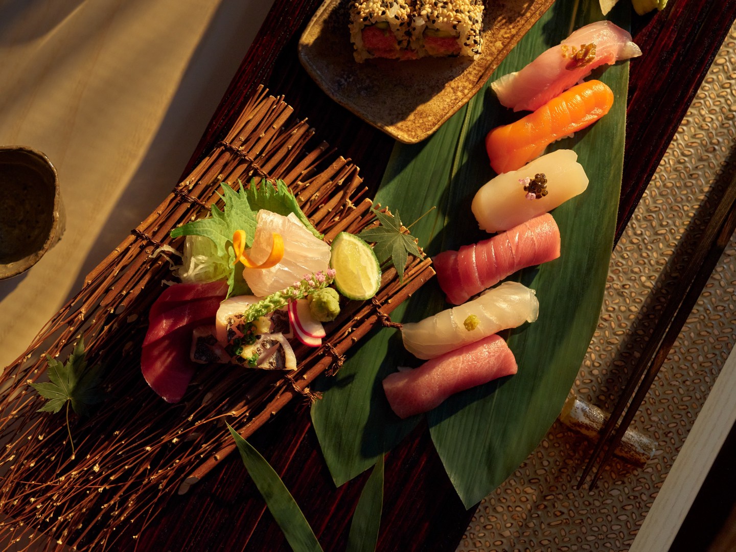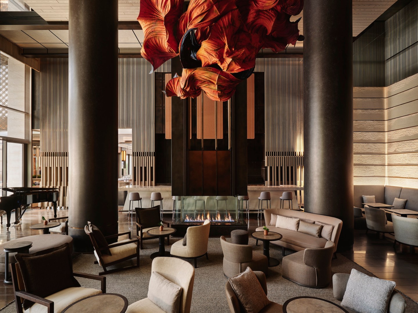 On the other side of the lobby is Nama, a Japanese restaurant spearheaded by Chef Takuma Yonemaru, serving dinner and custom craft cocktails, with a special dedicated bar off the side of the entrance just for the omakase menu. The designers took the omakase dedication very seriously—so much so that the table is made from one massive slab of hinoki wood (a type of cypress), sourced from northern Japan. Otherwise, most of the restaurant’s design is very much Frank Lloyd Wright-inspired architecture, with central atriums that separate the dining areas, speaking to the verticality of the space.