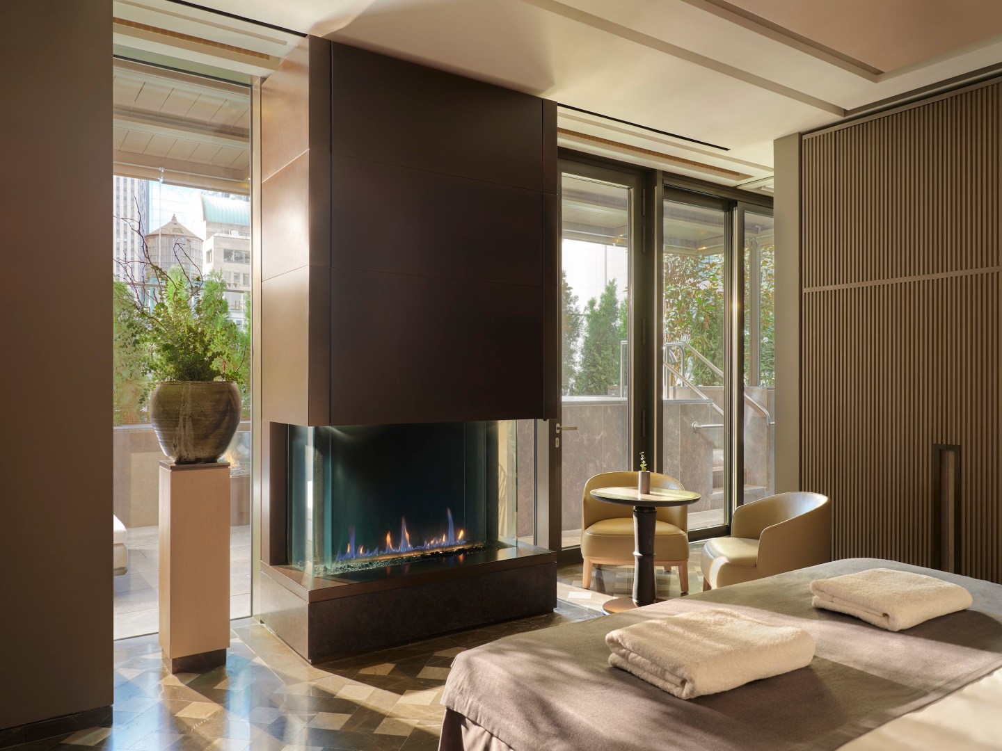 Right below the fitness center is the Pilates and yoga studio as well the spa treatment and locker rooms. And while certainly massages and facials are on the menu, that’s on the beginning of what’s on offer. Guests can book treatments that last anywhere between one to nine hours. (A happy medium might be the “New York Signature Treatment,” a two-hour session that includes a full body scrub and a 60-minute massage.) Guests looking for an extra special spa day might consider booking one of the private suites, which include a private relaxation area, a private outdoor terrace (constructed similarly to the one on the 14th floor with snowmelt floors and a retracting roof), a private treatment room, a private sauna, and even a private hammam for a full scrub. The private suites also come with tasting menus with mezzes, so you really can spend the whole day there.