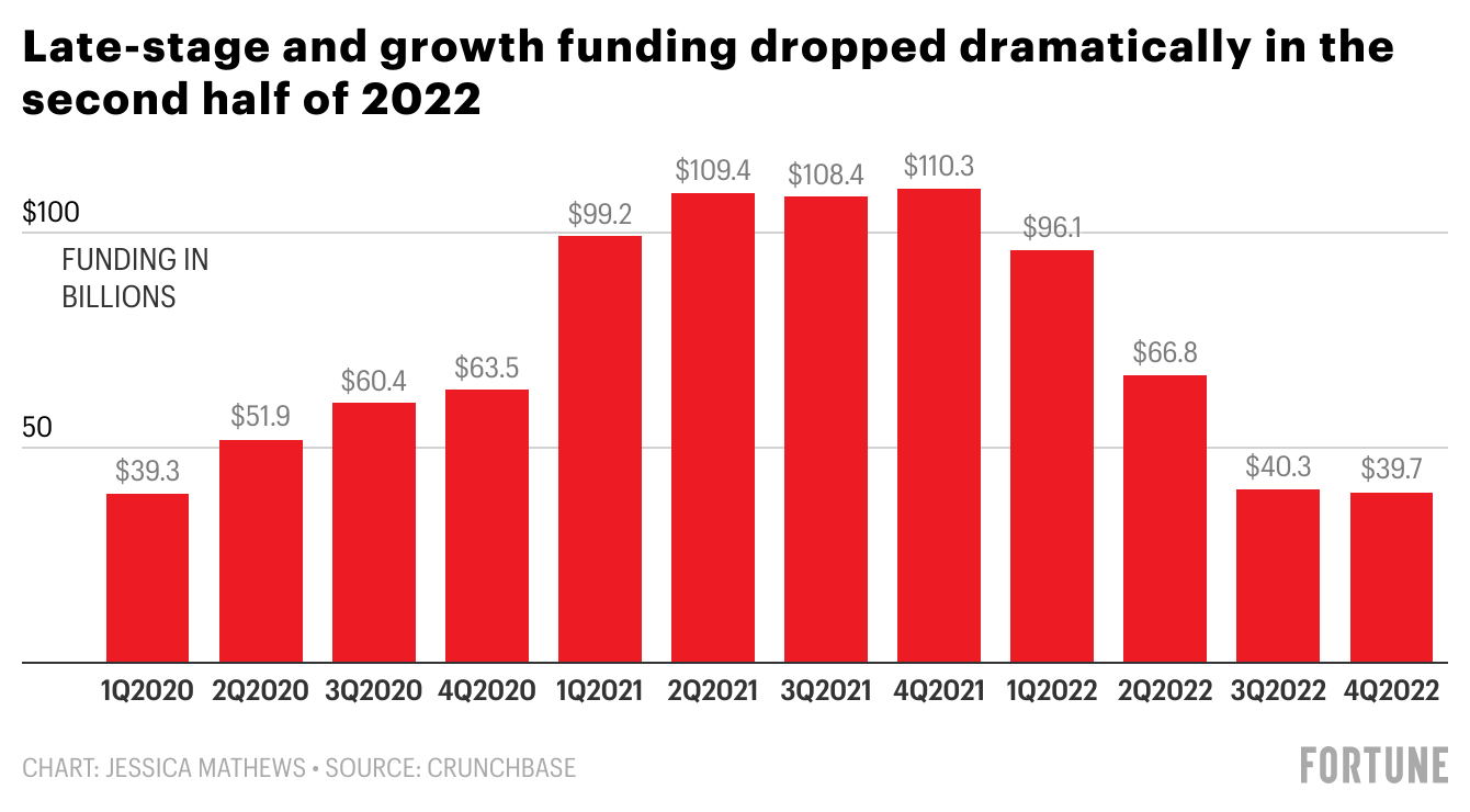 The pullback is being felt even in seed stages now. Seed-stage and angel funding dropped 35% in the fourth quarter of 2022 compared to the year-ago period, per Crunchbase. And late-stage companies, which have been experiencing the brunt of the pullback, saw funding levels drop to $40 billion in the fourth quarter, down 64% from 2021 levels.