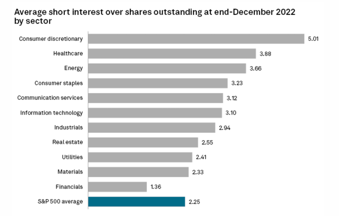 Betting that high inflation would continue to deteriorate demand, short sellers stuck with consumer discretionary (non-essential goods) stocks throughout 2022, according to the latest S&P Global Market Intelligence data. Short interest in consumer discretionary stocks on all major U.S. exchanges ended 2022 at 5.01%. It was the most-shorted sector throughout the year, the report found. Short interest, which measures the percentage of outstanding shares held by short sellers, averaged 2.25% for the S&P 500 at the end of 2022.