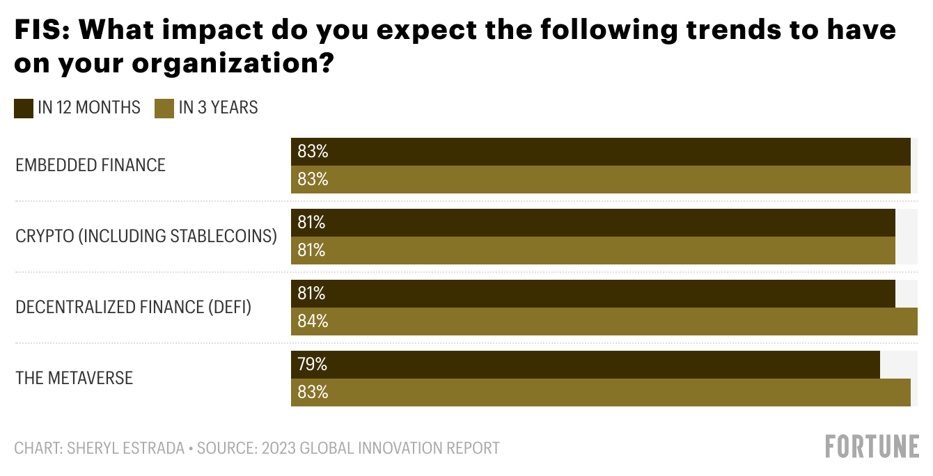 A new report by FIS (NYSE: FIS), a financial services technology company, is based on a global survey of 875 financial services executives (banks, insurers, capital markets firms, and fintechs). The respondents named embedded finance (non-financial companies offering financial products and services), crypto (including stablecoins), Decentralized Finance (DeFi), and the metaverse, as trends that will impact their businesses this year.