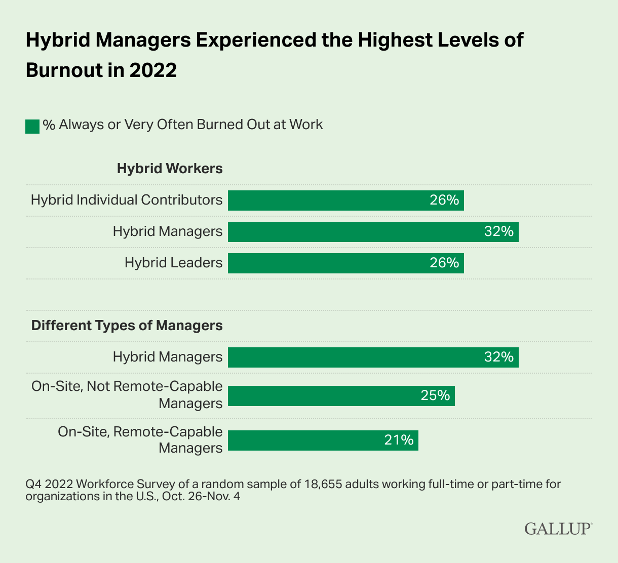 A new Gallup report, "6 workplace finding leaders need to navigate this year," explores where leaders and managers need to focus their efforts. One of the findings: Although the majority of employees prefer hybrid work, it has simply put more on their manager's plate. From the daily coordination of employees who are on different schedules and working from different places to not being able to observe all of the real-time interactions of the team they’re managing, has brought new challenges. As a result, hybrid managers are now more burned out than their direct reports and their bosses, Gallup finds.