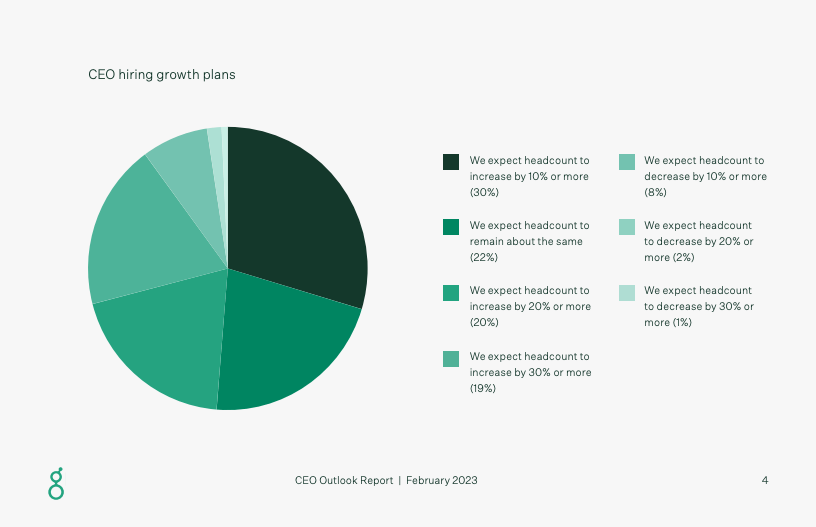 In the Greenhouse survey, just 11% of CEOs said they expect to reduce their firm’s headcount this year. And roughly a third of chief execs plan to increase their headcount by 10% or more, while 19% plan a 30%-plus increase.