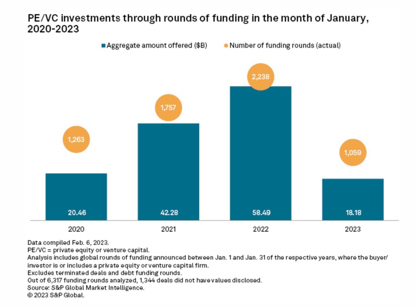The number of funding rounds with global venture capital participation was down in January 2023 (52.6%) to 1,059 rounds, from 2,238 rounds in January 2022, according to new S&P Global Market Intelligence data. Global venture capital investment fell 68.9% year over year in January to $18.18 billion from $58.49 billion. PhonePe Private Ltd., a digital payment applications developer, raised the largest funding round in January with a transaction value of $1 billion, S&P Global Market found.