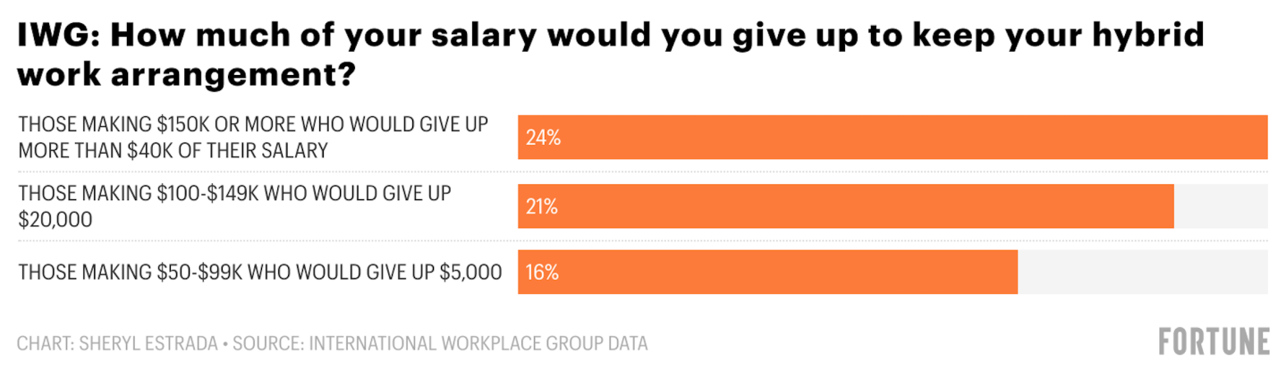 International Workplace Group (LSE: IWG), a major provider of flexible workspace, conducted a pulse survey of workers and how much they value hybrid work. According to survey data IWG provided to Fortune, about a quarter (24%) of those making more than $150,000 or more would give up more than $40,000 of their salary to keep their hybrid work arrangement. Meanwhile, 21% of those who earn $100,000-$149,000 would give up $20,000. And 16% of those making $50,000-$99,000 would give up $5,000. IWG’s commissioned survey was conducted by Mortar Research earlier this month of 1,015 U.S.-based hybrid workers. The survey also found that generations value hybrid work differently. Twenty-two percent of millennials and Gen Zers would be willing to give up 31-40% of their salary to keep a hybrid work arrangement, none of the baby boomers or Gen Xers said the same. However, 25% of baby boomers and 21% of Gen Xers would give up 1-10% of their salary. Another finding is 46% of hybrid workers believe that friendships play a key factor in choosing to stay at a company.