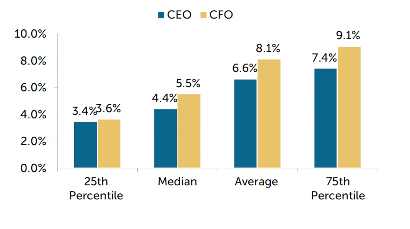 Approximately 80% of CEOs and CFOs in the research sample received base salary increases. Of the companies making increases, the median increase was 4.4% and 5.5% for CEOs and CFOs, respectively. Looking deeper, the range of salary increases for chief executives is 3.4% to 7.4% whereas their finance chief counterparts ranged from 3.6% to 9.1%.