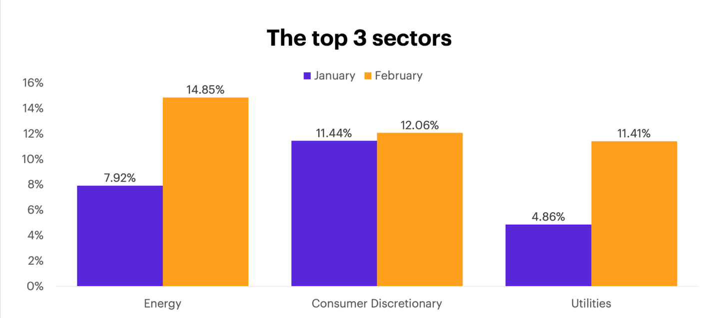 Morgan Stanley’s E-Trade released data from its monthly sector rotation study. The top three sectors in January and February were energy, consumer discretionary (nonessential goods and services, like cars and entertainment), and utilities. The results are based on the trading platform’s customer notional net percentage buy/sell behavior for stocks that comprise the S&P 500 sectors. All three sectors increased between January and February, with energy increasing from 7.92% to 14.85%, according to the report.