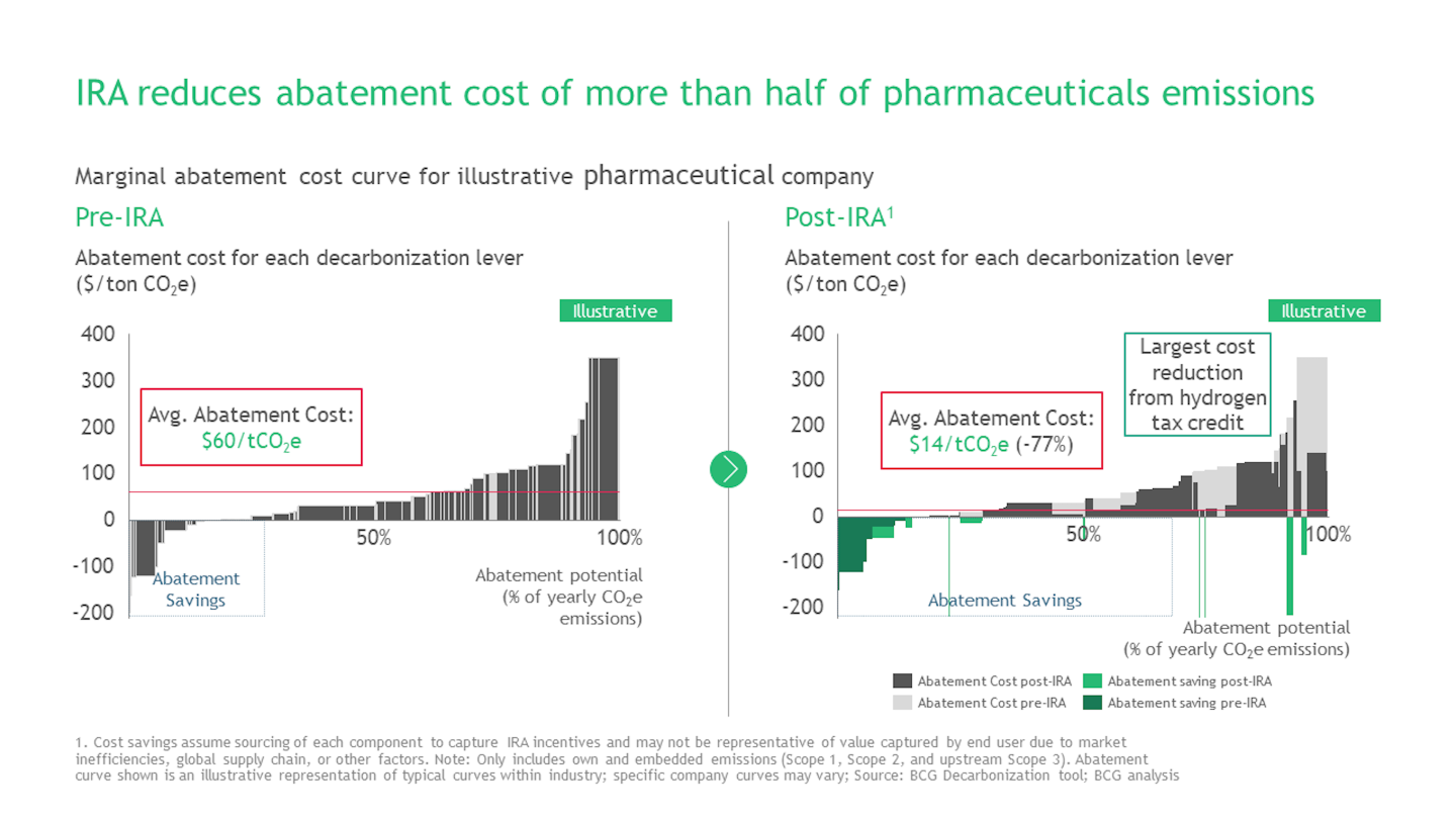 In the immediate term, new policies have fundamentally changed the economics of many critical decarbonization technologies. Companies should start by reassessing their marginal abatement cost curves (MACCs) to surface decarbonization levers made newly attractive by net cost savings. Taking the pharmaceutical industry as an example, the IRA makes 56% of emissions cost saving to abate.