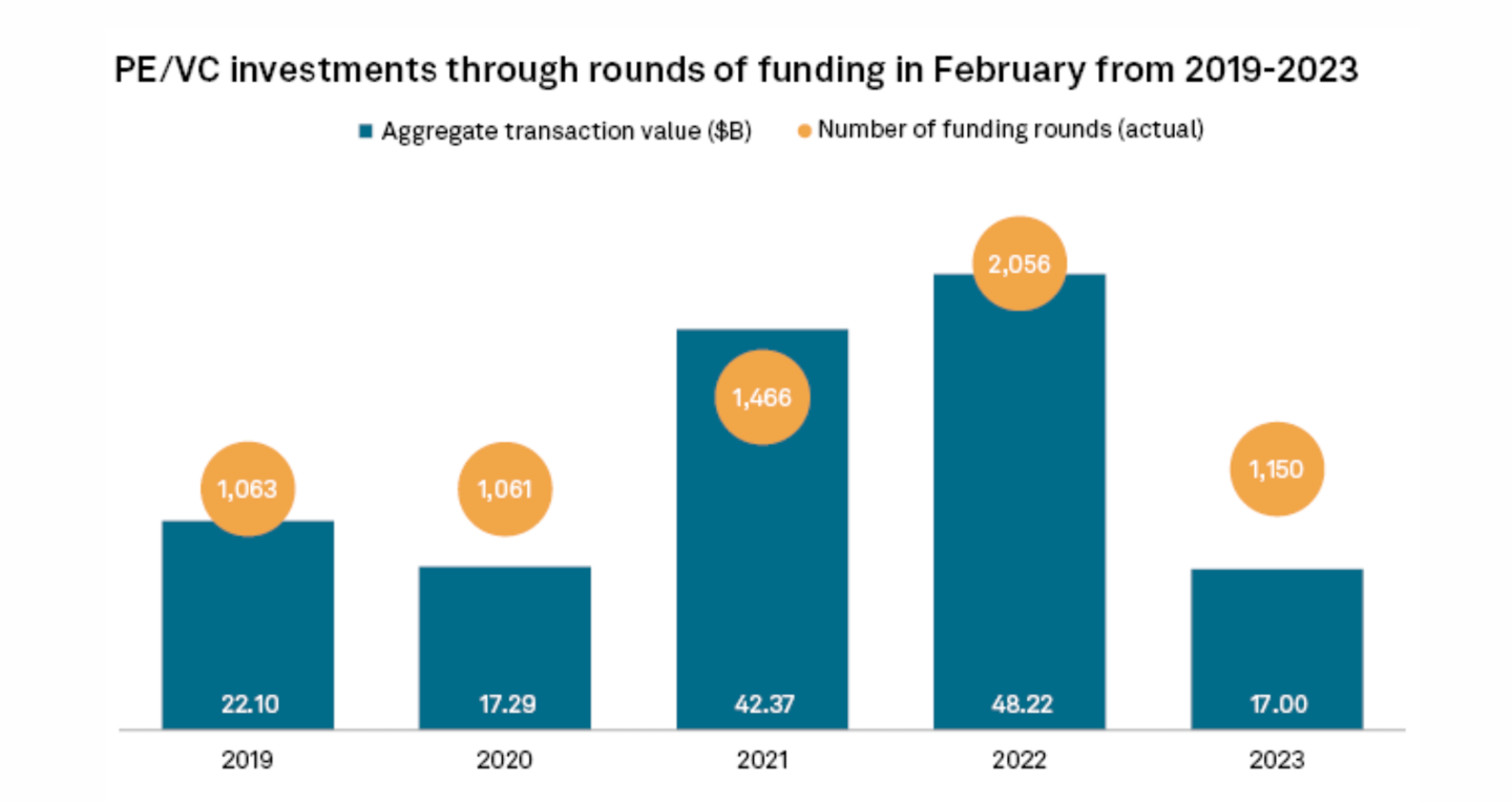 According to S&P Global Market Intelligence data, venture capital investments worldwide fell 64.7% in February to $17 billion from $48.22 billion a year prior. The number of funding rounds with venture capital participation was down by almost half (44%) to 1,150 rounds from 2,056 rounds in February 2022, the research found. The total amount raised also declined from $19.46 billion in January via 1,197 rounds.