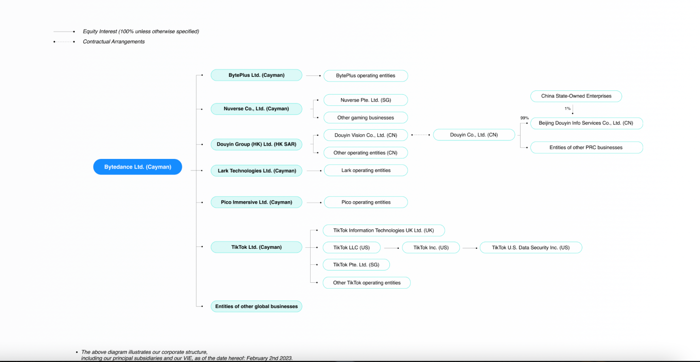 Notably, the only direct connection to China shown in the corporate structure chart is through the Hong Kong-based Douyin Group. Douyin is the name of the Chinese version of the TikTok app, which operates under different rules than the TikTok version of the app available to users in the U.S. and other countries.