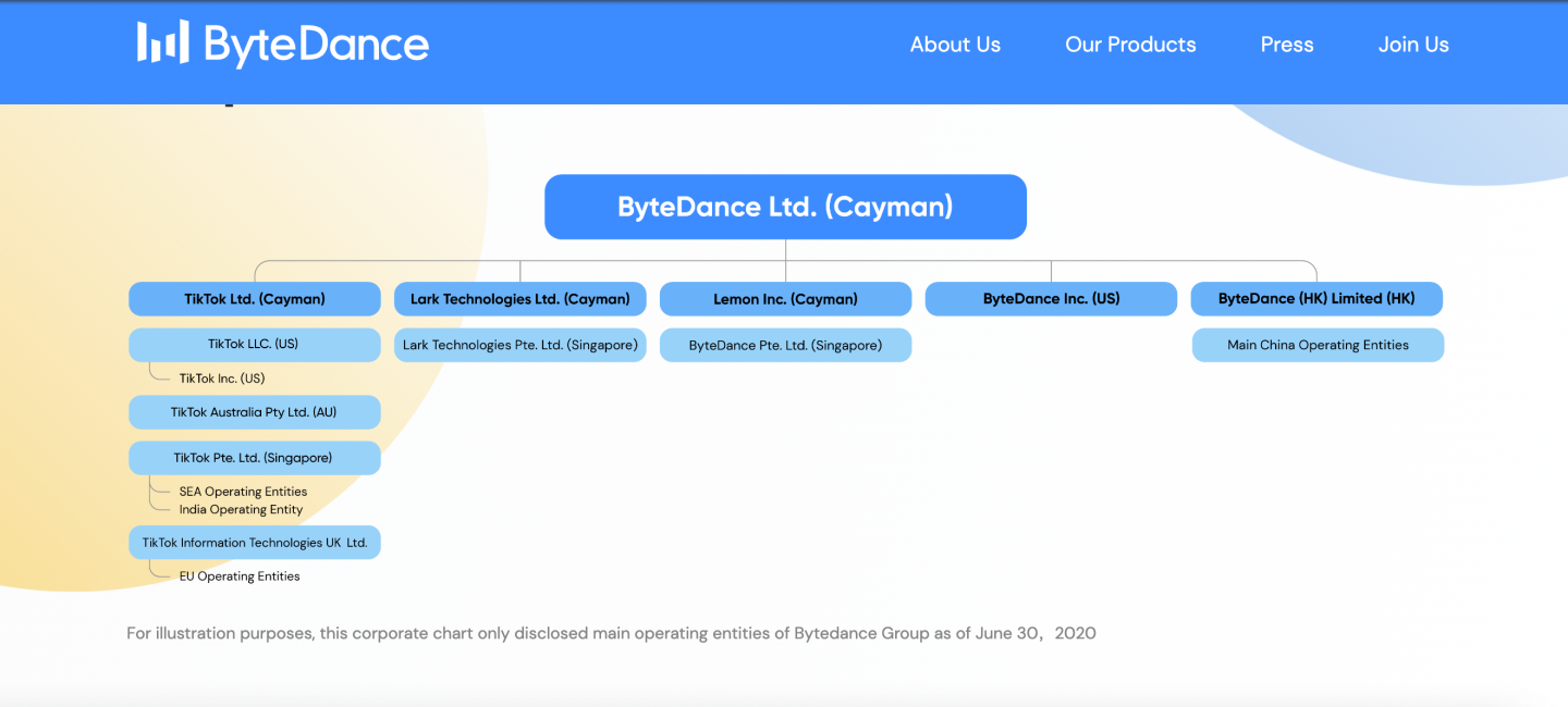 A new chart posted on the ByteDance website depicts the various corporate entities within the organization, along with the global locations in which they’re incorporated. The chart, titled “Corporate Structure,” shows TikTok Ltd. as one of seven subsidiaries of the Cayman Islands–based ByteDance Ltd.