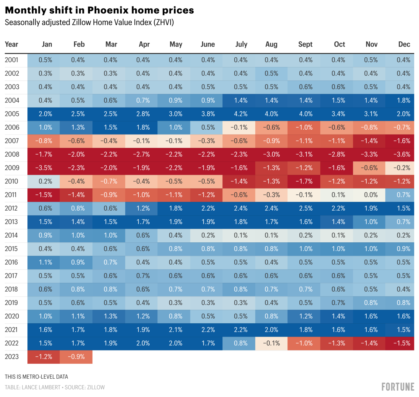 But as mortgage rates spiked last year, Phoenix's frothy home prices became a liability. That affordability strain helped push the market into one of the sharpest corrections in the country. Through February, Phoenix home prices as measured by Zillow are already down 7.3% on a seasonally adjusted basis since its peak. Without seasonal adjustment, Phoenix home prices are down close to 10% since its 2022 peak.