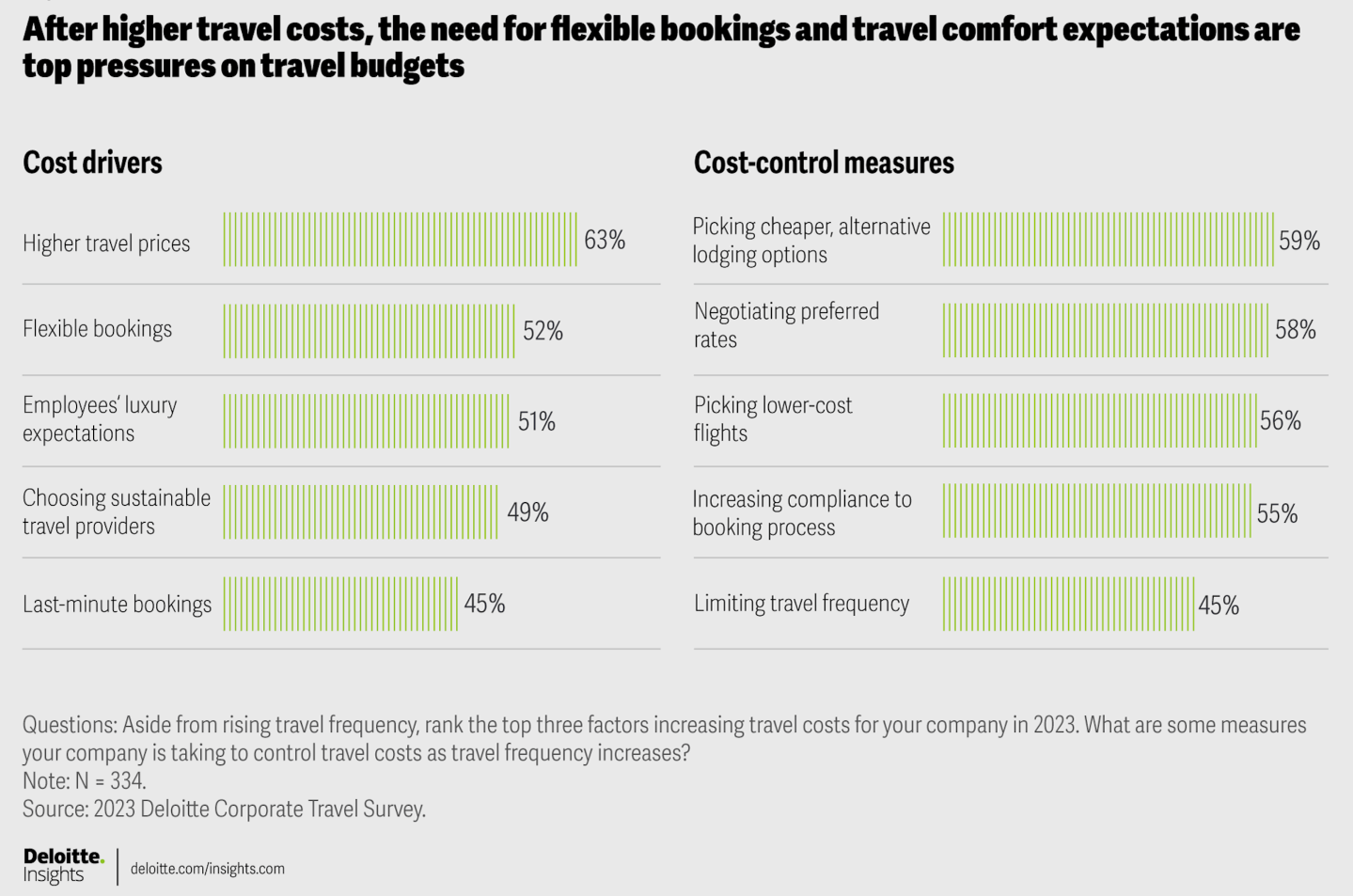 About half of the respondents say that employees’ expectations of luxury services (such as first or business-class airfares and upscale hotels) and the need for flexible or last-minute bookings are pushing costs up in 2023, according to Deloitte. Meanwhile, 49% say that pursuing sustainable providers also adds to costs. Cost control measures include picking cheaper, alternative lodging models (59%), picking lower-cost flights (56%), and increasing compliance with the booking process (55%). And some are limiting travel frequency (45%). The findings are based on a survey of 334 travel managers, executives with various titles, and travel-budget oversight.