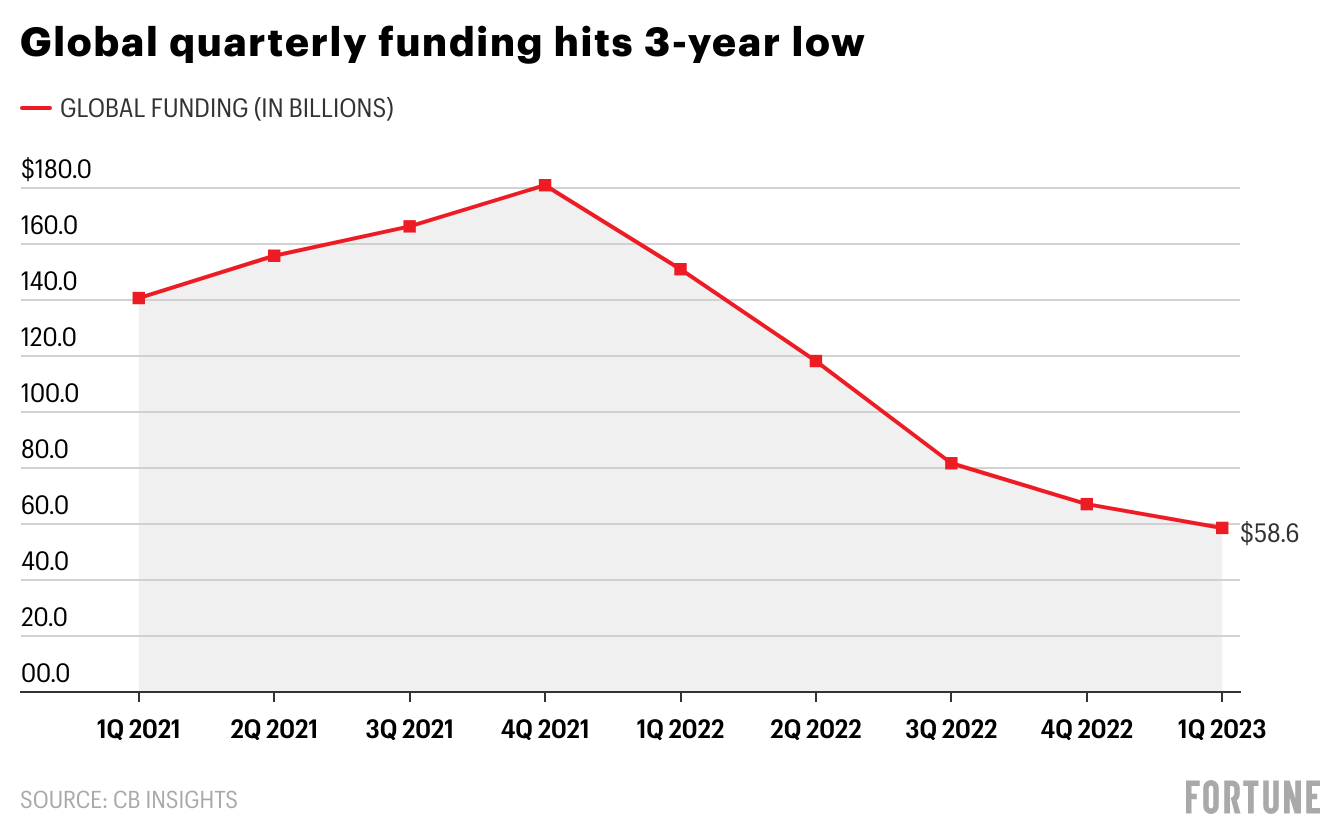 Startups around the globe raised a collective $58.6 billion in venture funding in the first quarter—dropping 13% from the last quarter and at their lowest levels since pre-pandemic, according to new data from CB Insights. In the U.S., numbers were a bit steadier, but only because of Stripe’s whopping $6.5 billion funding announcement in mid-March. International startups, in particular, are struggling to fundraise at the same levels they had been, with funding in Latin America, Asia, and Europe declining by 54%, 27%, and 12% respectively.