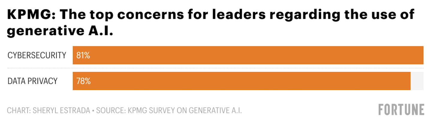 Most executives say they are unprepared for immediate adoption of generative A.I., according to a survey by KPMG U.S. released this morning. The findings are based on a survey of 225 U.S. executives at companies (revenue of $1 billion and above) in the last two weeks of March. The executives say generative A.I. (78%) will overwhelmingly have the greatest impact on their business, followed by advanced robotics (40%), and quantum computing (33%). However, 60% say they are still a year or two away from implementing their first generative A.I. solution. Respondents cite cost and lack of business case as the two highest barriers to implementing generative A.I. But cybersecurity (81%) and data privacy (78%) concern leaders the most. More than half (66%) of respondents also say they plan to increase their understanding of the technology for adoption.