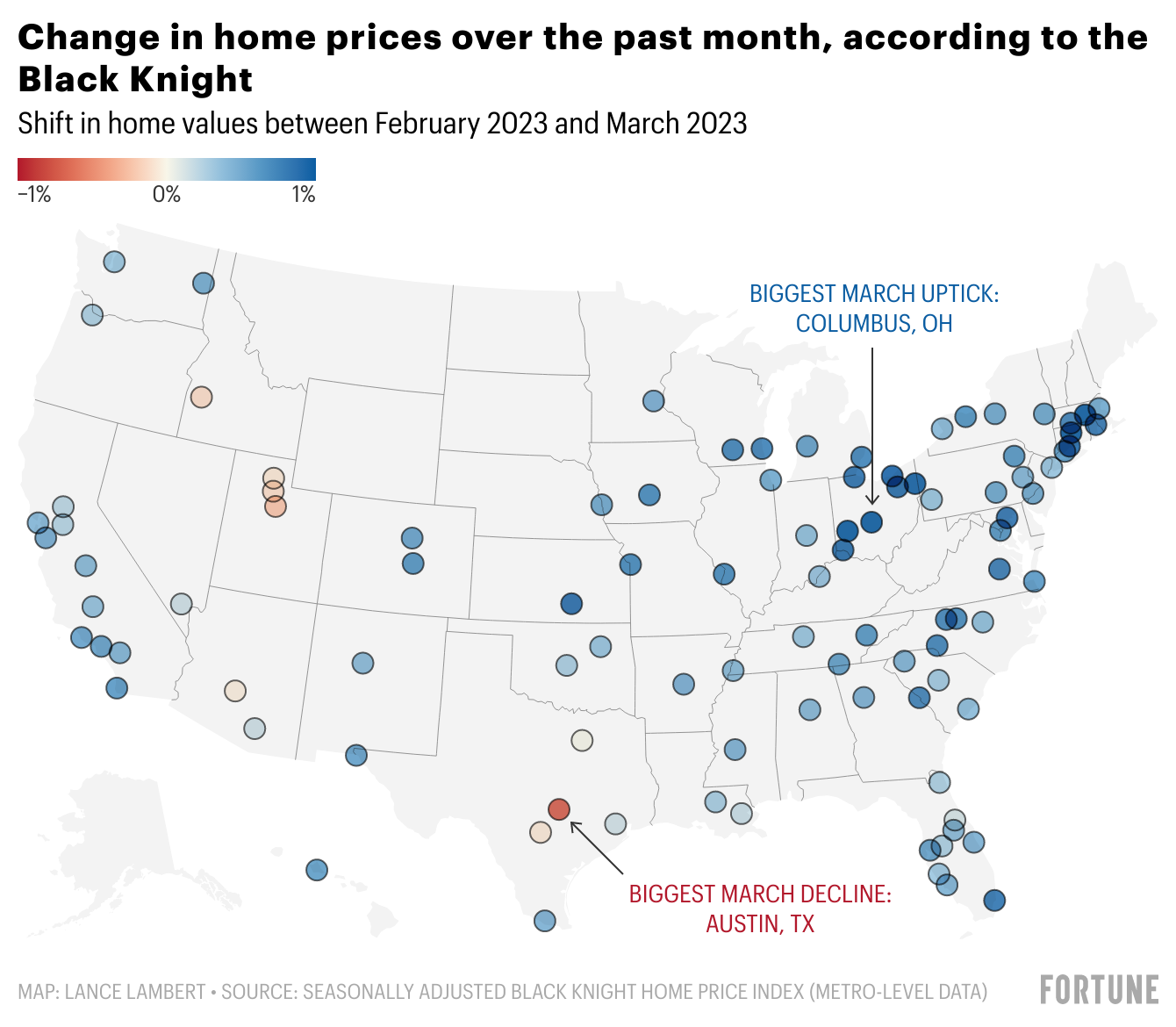 The home price correction continues to lose steam. That’s according to the latest data published Wednesday by the Black Knight Home Price Index. Between February and March, the mortgage lending giant’s latest monthly reading finds that 93 of the nation’s 100 largest housing markets saw a month-over-month home price increase. Meanwhile, just seven of the 100 largest markets individually tracked by Black Knight saw a month-over-month home price decrease.