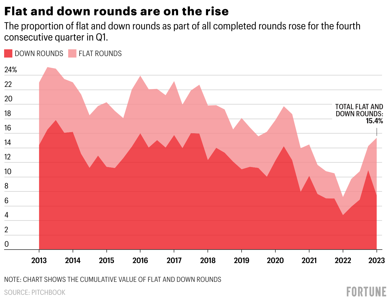 To be sure, a down round isn’t the end of the world, and we’ve even seen some of the most venerable private companies take it on the chin (I’m thinking of Stripe, of course, which raised a whopping $6.5 billion in March at a $50 billion valuation—a massive drop from their last valuation of $95 billion in 2021). In fact, some VCs like Brian Ascher of Venrock told me earlier this year that a Stripe down round could actually be a good thing for startups to see: “Being willing to take money at lower prices is just reality, and there should be a strong preference to take a clean deal at a lower price than increase your own risk by doing unnatural acts to maintain your valuation by having all sorts of structure and terms around you that tend to bite you at the exact wrong time when things go bad,” he told me back in January.