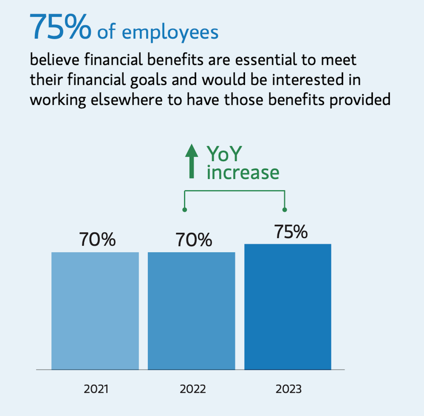 The research also found that financial benefits may drive retention. Eighty-nine percent of employees say they’d stay at a company for the right financial benefits package. And 75% of employees would be willing to work elsewhere in order to have those benefits provided. The findings are based on a survey of 1,000 U.S.-employed adults and 600 HR leaders for companies.