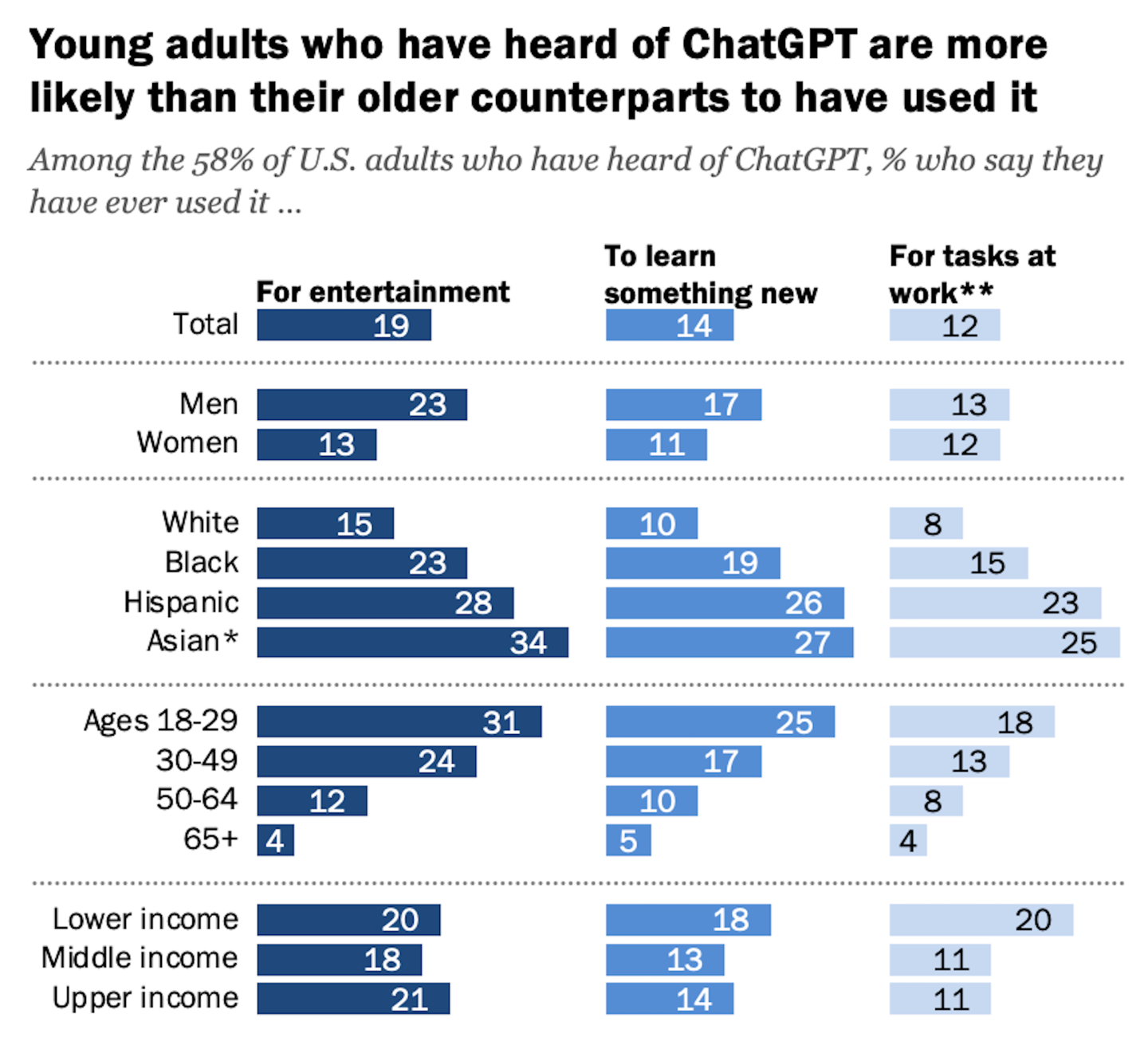 A new report by Pew Research Center found that 58% of U.S. adults surveyed have heard of ChatGPT. Of that percentage, 19% say they have used it for entertainment, 14% have used it to learn something new, and 12% are currently working for pay and have used ChatGPT at work. Adults under 30 who have heard of ChatGPT are far more likely than those 65 and older to have used the chatbot for entertainment (31% vs. 4%). Pew also asked respondents about their experience with the chatbot. Fifteen percent say it has been extremely useful, and 20% say it's very useful. Meanwhile, 39% say it has been somewhat useful. The data is based on a survey of more than 10,000 U.S. adults conducted March 13-19, 2023.