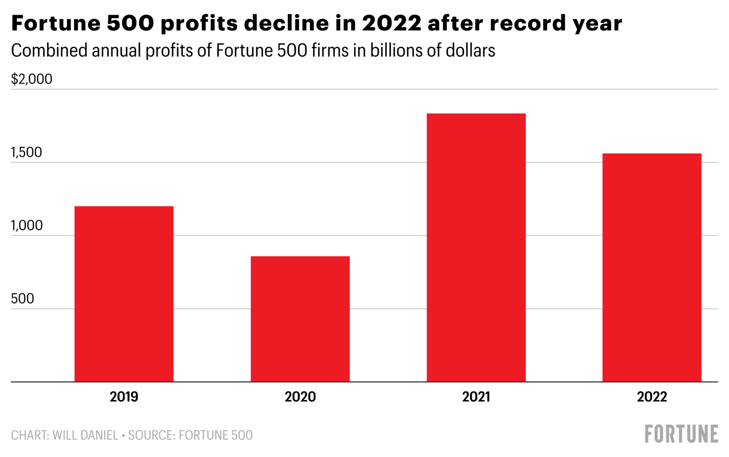 In 2021, Fortune 500 companies earned $1.84 trillion in profits on $16.1 trillion in revenue. But last year, although revenue rose to $18.1 trillion, profits dropped roughly 15% to $1.56 trillion.