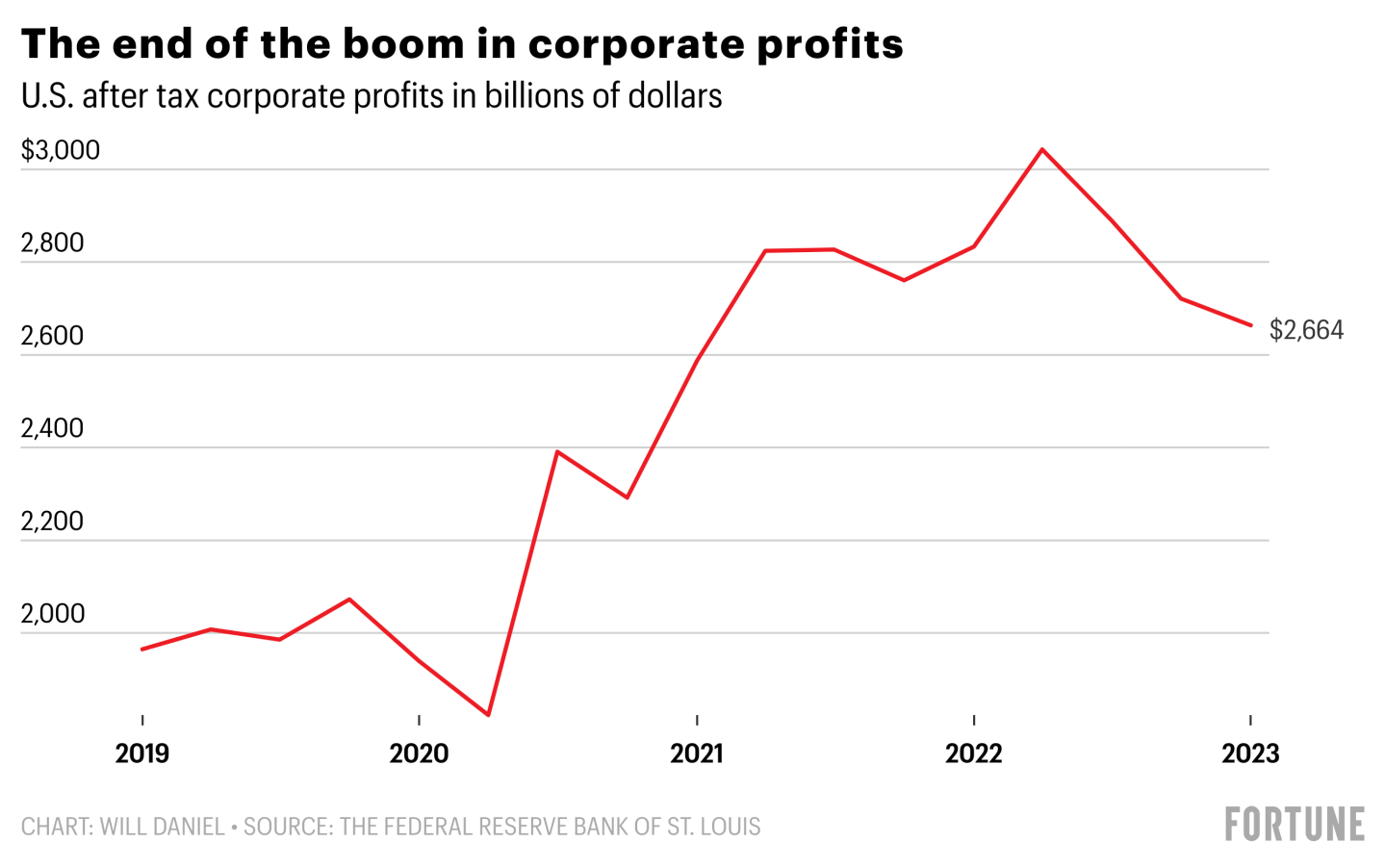 It’s not just Fortune 500 companies that are experiencing falling profits, either. Total after-tax U.S. corporate profits fell roughly 12% between their peak in the second quarter of 2022 and the first quarter of this year, according to data from the St. Louis Federal Reserve.