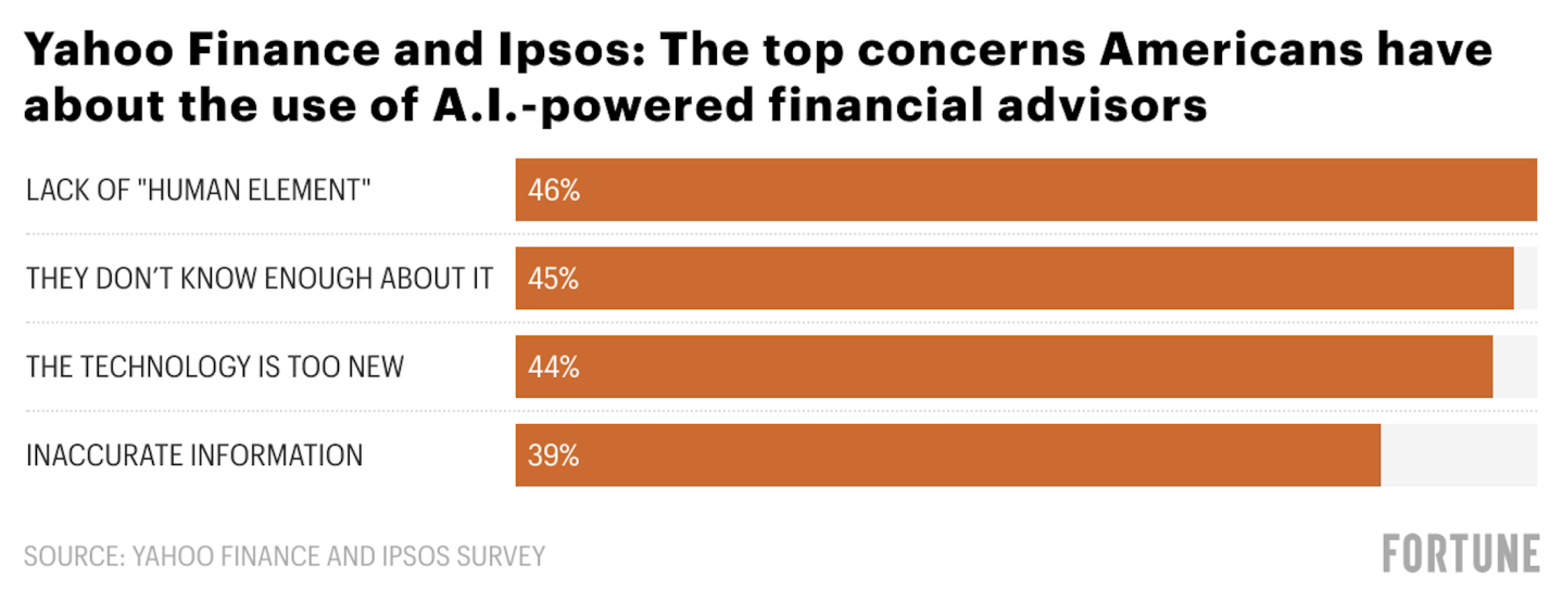 A new poll released by Yahoo Finance in partnership with Ipsos gauges Americans' opinions on the trustworthiness of artificial intelligence (A.I.) when it comes to finances. Although A.I. chatbots are already being used in the financial services sector, almost half of Americans surveyed said they don’t trust A.I. to advise them on their finances. The top concerns involving A.I. financial advisors include the lack of "human element" (46%), they don’t know enough about it (45%), the technology is too new (44%), and inaccurate information (39%), according to an announcement with results from the poll.
