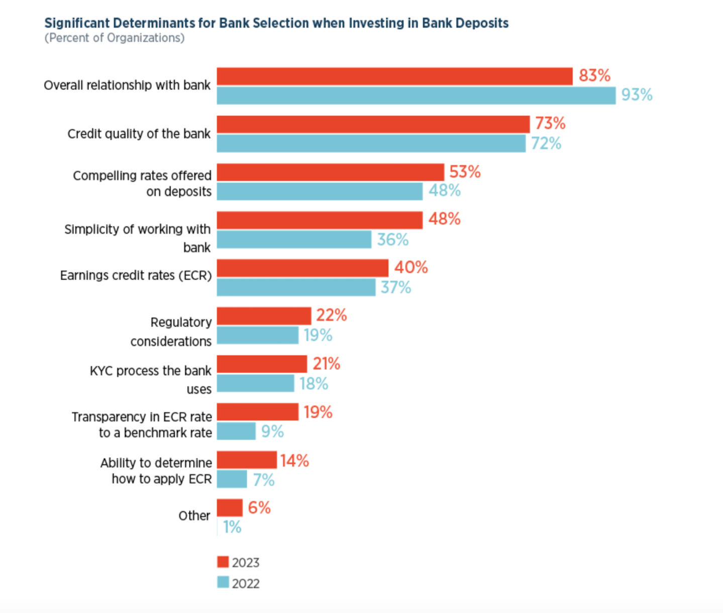 When choosing where to maintain deposits, 83% of respondents said the overall relationship with their banks is a primary determinant. That's down from 93% in 2022, this figure suggests treasury professionals are choosing to be more cautious as a result of recent bank failures, according to AFP. This year, 73% of respondents said the credit quality of the bank is also a determinant, a slight uptick from 72% last year.