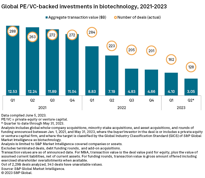 Despite a few recent high-profile VC deals in biotech, private equity and venture capital investors are not feeling the fervor to supercharge health care innovation. According to a new report from S&P Global Market Intelligence, both VC and private equity investment was down for the eighth straight quarter. In the first quarter of 2023, 162 transactions in the sector raised $4.1 billion, compared to 284 deals that raised $8.83 billion in the first quarter of 2022. Private equity deals are down drastically, as funding in the sector declined over 50% year over year in the first quarter of 2023. Investor excitement about the sector has waned after the push for health care innovation funding off the heels of the Covid-19 vaccine in 2021. There are also concerns that industry regulation could slow innovation in the sector, according to the report.