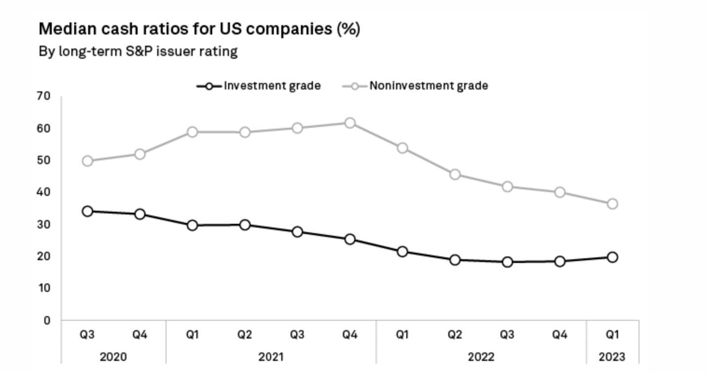 In the first three months of this year, the cash ratios of noninvestment grade-rated companies "were squeezed further," according to a new report by S&P Global Market Intelligence. The research found the median measure of cash and equivalents as a share of total liabilities of companies rated lower than BBB- by S&P Global Ratings, fell to 36.3% in the first quarter, from 40.1% at the end of 2022. There were declines in seven of the 11 sectors. The steepest decline was in the real estate sector to 67.1% from 78.4% at the end of 2022, but that remains significantly higher than in other sectors, such as consumer discretionary and financials, according to the report.