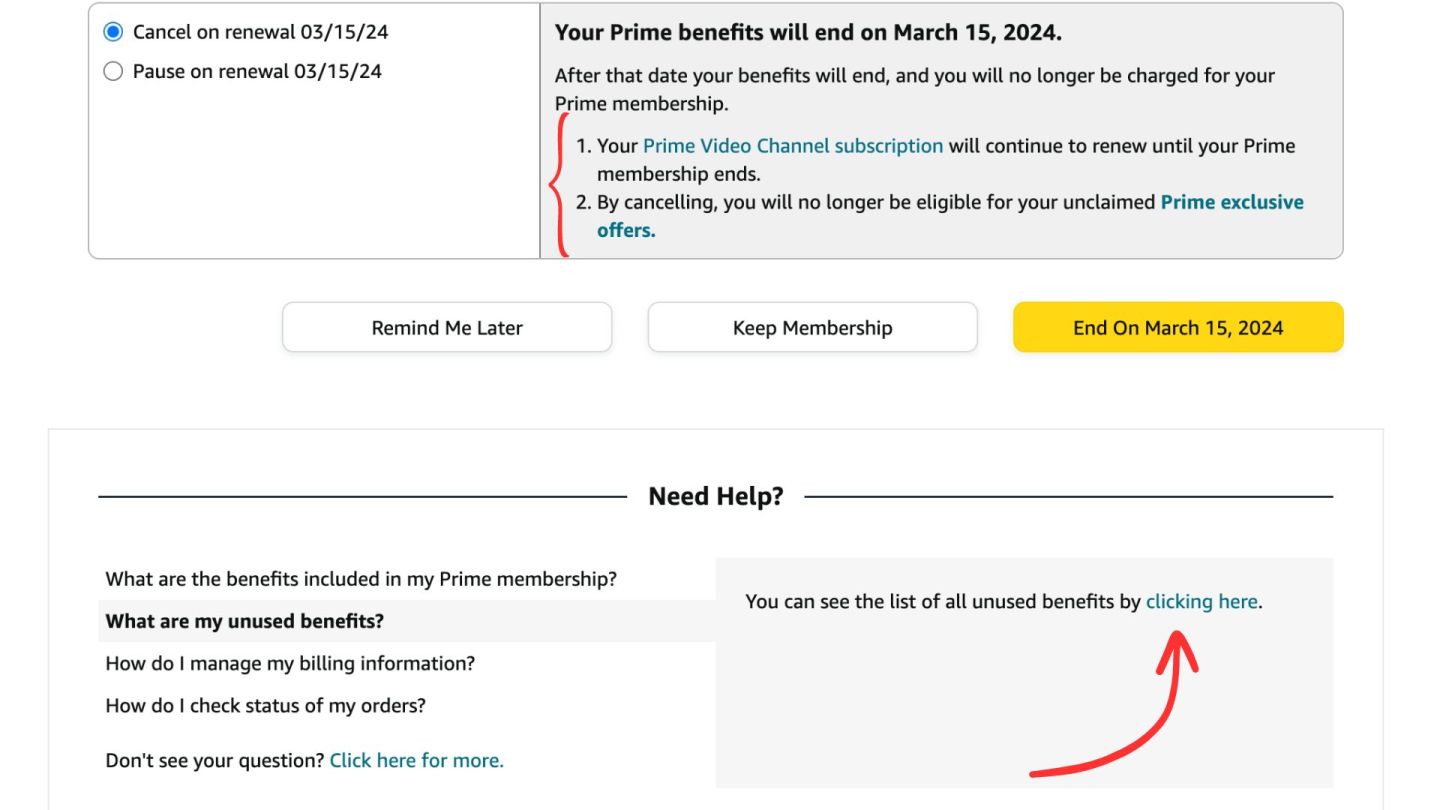 Guilt and shame are powerful human emotions. And according to the FTC, Amazon tries to tap into these sentiments, using special words and phrases that guilt-trip consumers against canceling their prime membership. At the top of this screenshot, Amazon addresses consumers directly, saying “you will no longer be eligible for your unclaimed Prime exclusive offers,” and links out to unused benefits.