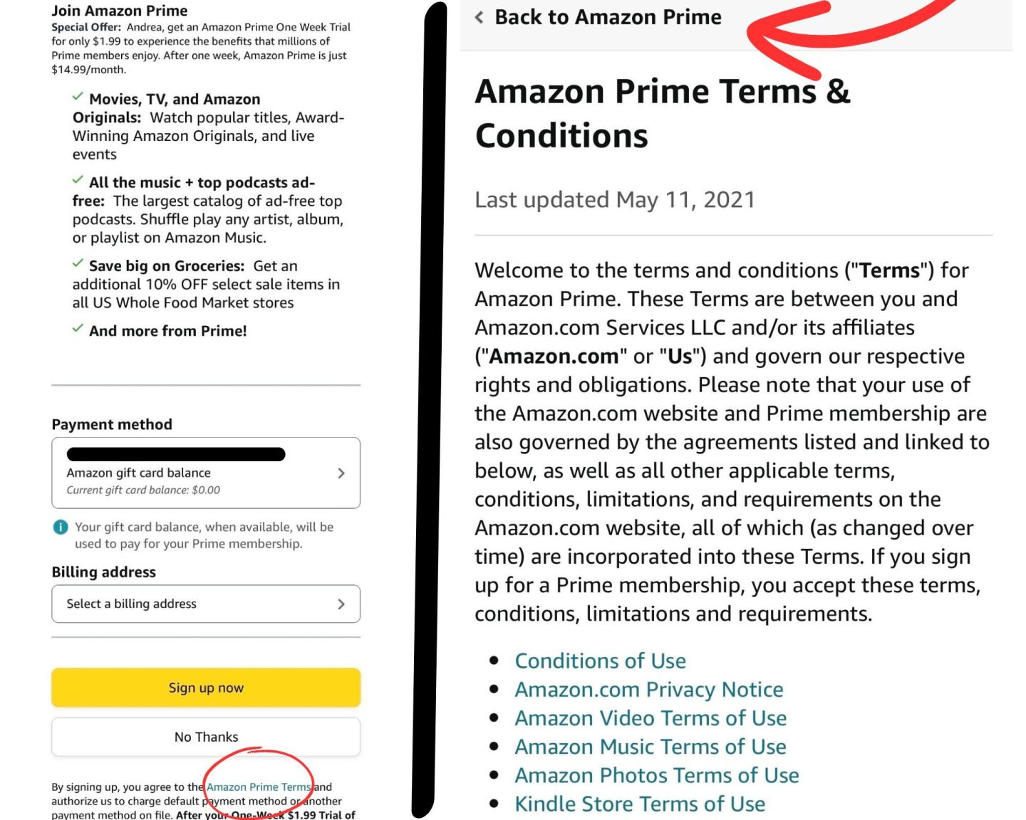 The sneaking design seems to still be in effect. The “Join Amazon Prime” page (shown here in the left screenshot) has a link in small font to read the Amazon Prime Terms. If users click the link, a new web page on a separate tab contains information about limitations of being a Prime member, such as shipping benefits not applying on all products and purchase thresholds. To learn about auto-renewals, consumers must read to the fifth subsection of Prime’s terms document.